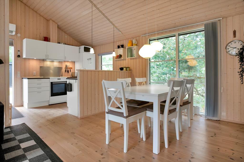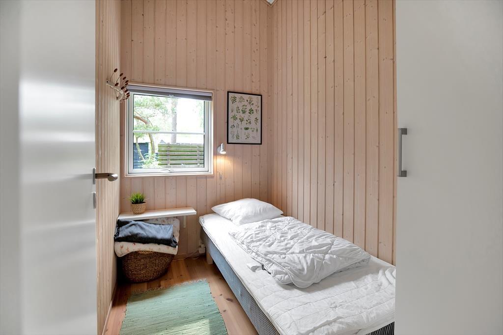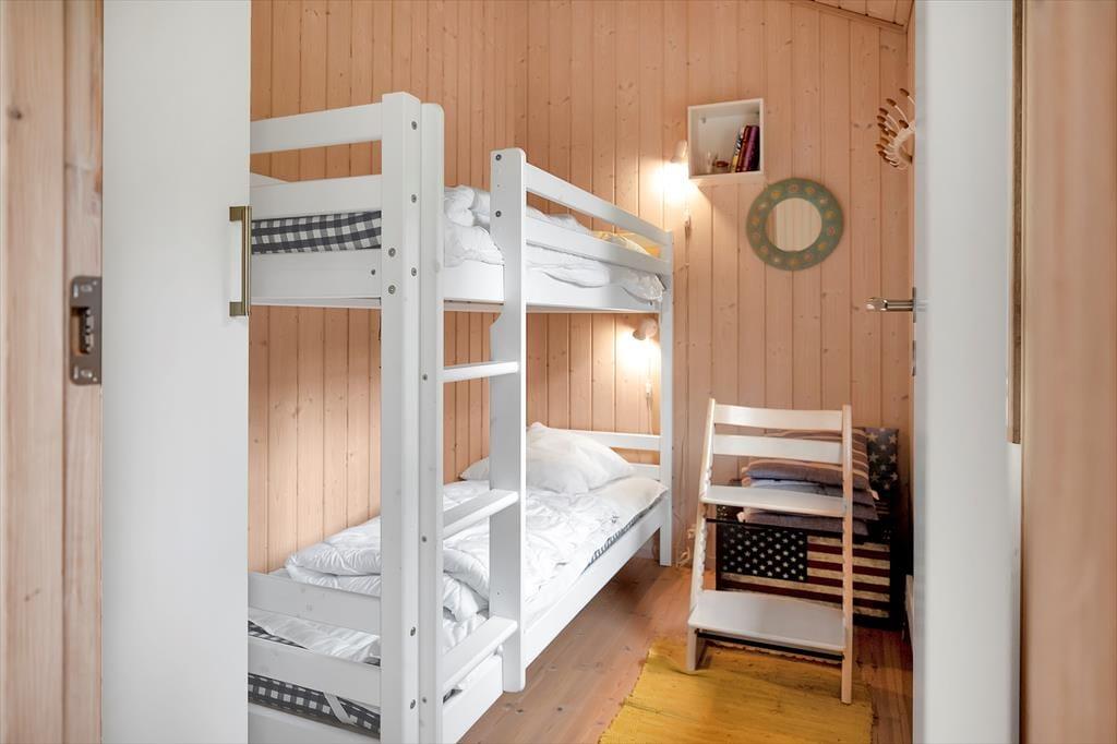 Feriehuset er indrettet med entre, soveværelse med dobbeltseng, værelse med enkeltseng og børneværelse med køjeseng. Der er badeværelse med brus og i forbindelse med stuen er der et fint åbent køkken. Alt fremstår lyst og indbydende. Der er en dejlig stor delvist overdækket terrasse til huset.