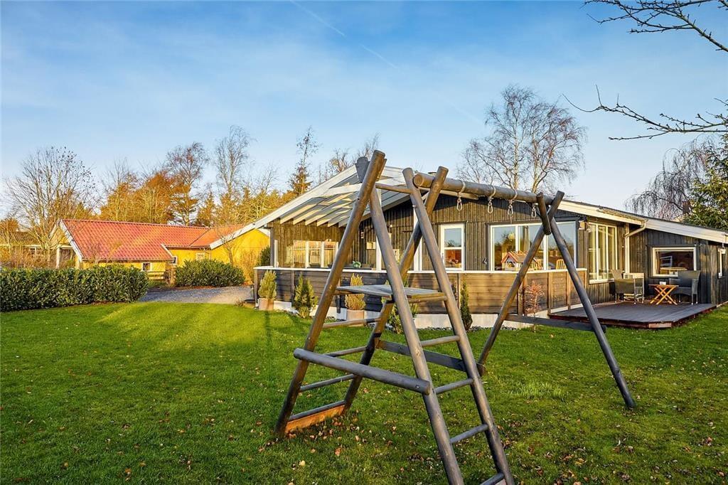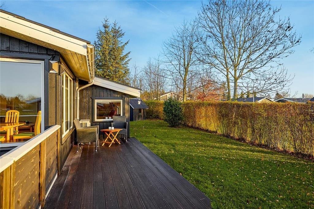 Sommerhuset har en stor overdækket terrasse, og desuden en morgenterrasse hvor morgenkaffen kan nydes. Grill, havemøbler og liggestole er til rådighed. Til børnene er der både gyngestativ, legehus og sandkasse.