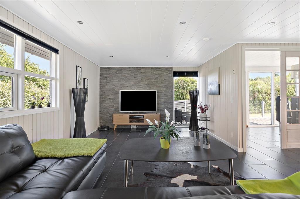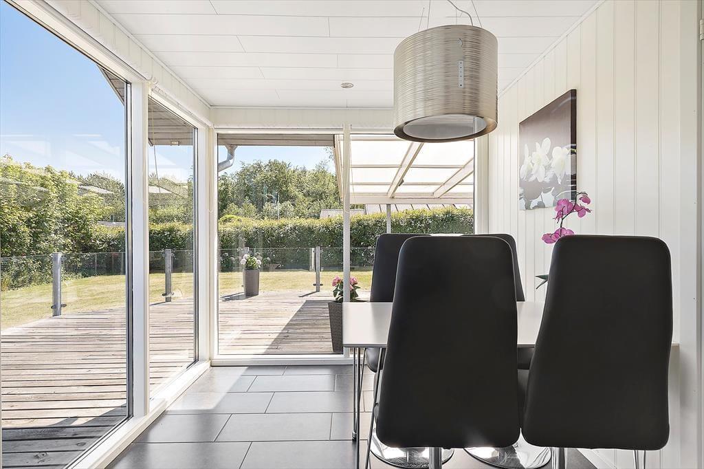 Sommerhusets smart integrerede udestue har et fantastisk lysindfald, som inviterer til ren nydelse. Her kan du slappe af med en lydbog og en læskende kold drik eller måske bare lade tankerne flyve frit.