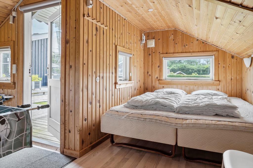 Desuden er der to velindrettede soveværelser med dobbeltsenge og skabsplads, samt badeværelse med vaskemaskine.Sommerhuset har et tilhørende anneks med sengeplads, TV, fodboldspil, dart, perfekt til de unge mennesker. Udover tv-kanaler er der WiFi og Chromecast i huset til streaming af egne tjenester.