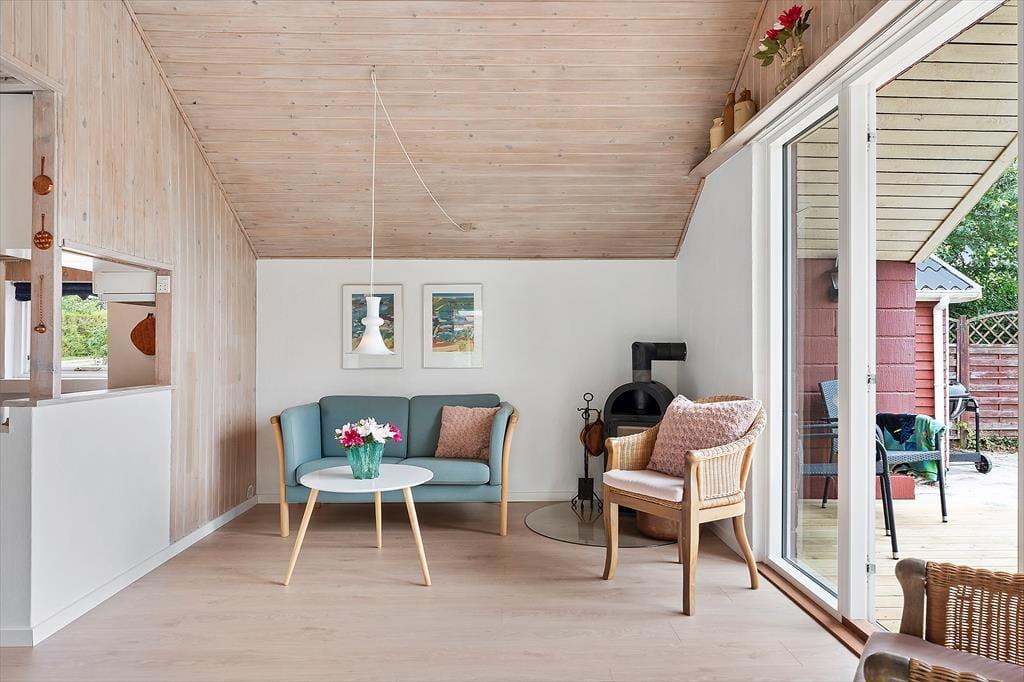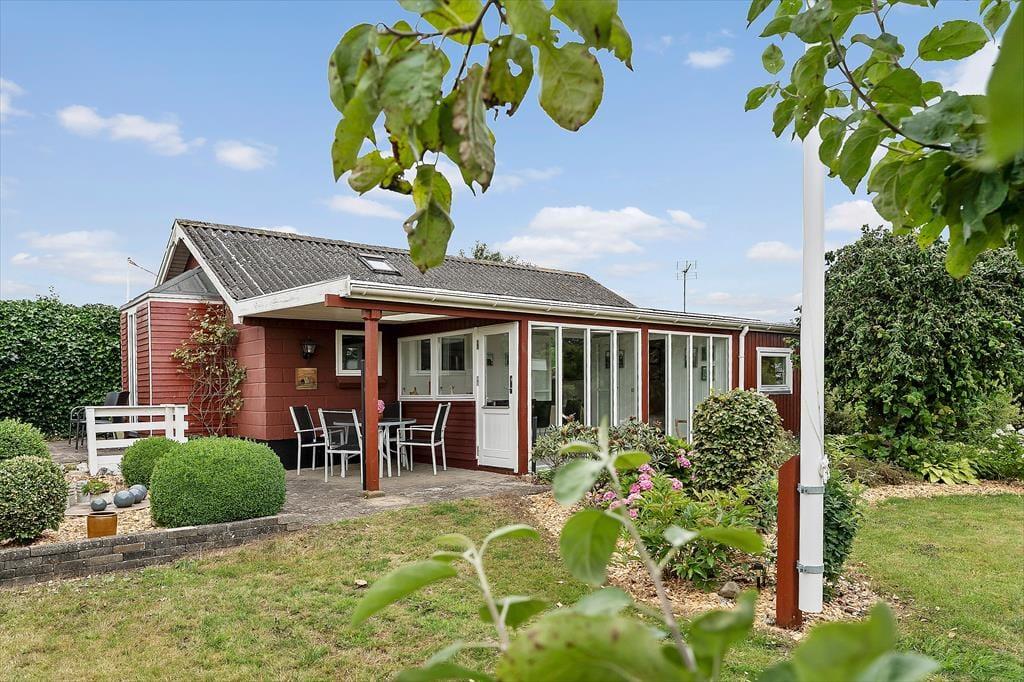 Mellem den strålende blå himmel og de fortryllende grønne træer ligger dette dejlige klassisk sommerhus. Som byder på ren ferieoplevelse med en charmerende have, komfortable værelser, et badeværelse og en indbydende stue samt udestue. De store vinduer i stuen lader det naturlige lys strømme ind og skaber en lys og luftig atmosfære, der indbyder til ro og afslapning. Her kan du fordybe dig foran brændeovnen på kølige aftener, mens varmen omfavner dig, og du nyder en god bog med benene oppe og en skøn kop kaffe i hånden. I den hyggelige overdækkede udestue kan man også nyde sine måltider. Alle rum er designet til at skabe en følelse af hjemlig hygge og ferieafslapning, så du kan sænke skuldrene og lade hverdagens stress forsvinde i det fredfyldte miljø.