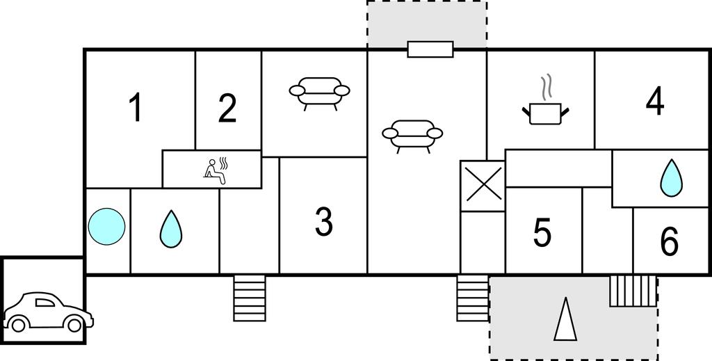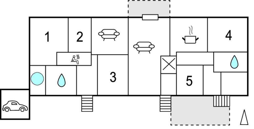 Ejendommen indeholder 6 soveværelser, 2 badeværelser, heraf det største med spabad og sauna, samt flere store stuer med komfortable møbler. Et soveværelse (S2) er et gennemgangsværelse.