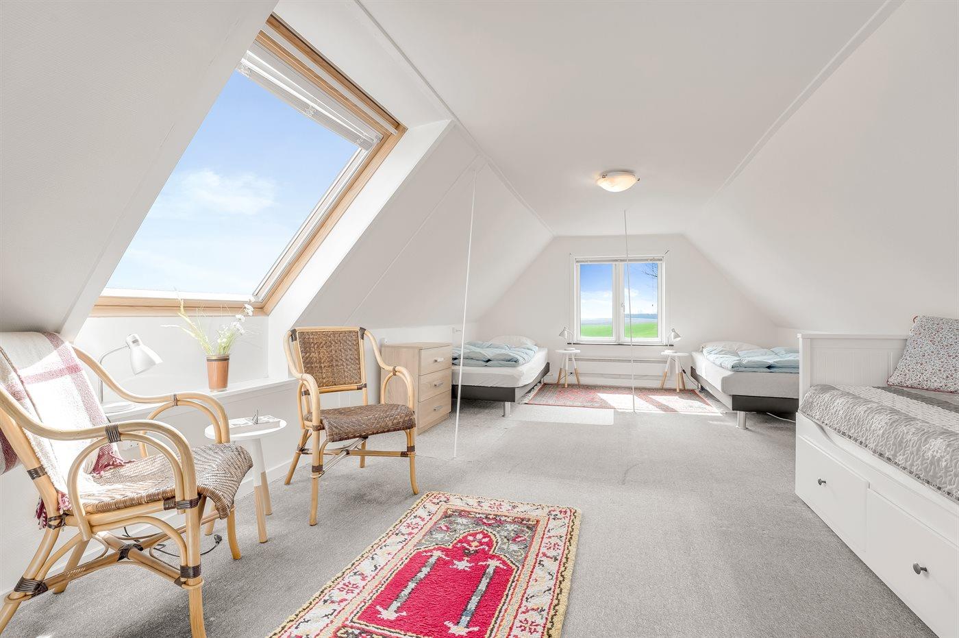 Der er i alt 3 soveværelser. Sovepladserne fordeler sig på: 2 sovepladser i dobbeltseng. 6 sovepladser i sovesofa (dobbelt). Derudover er der 1 stk. barneseng.