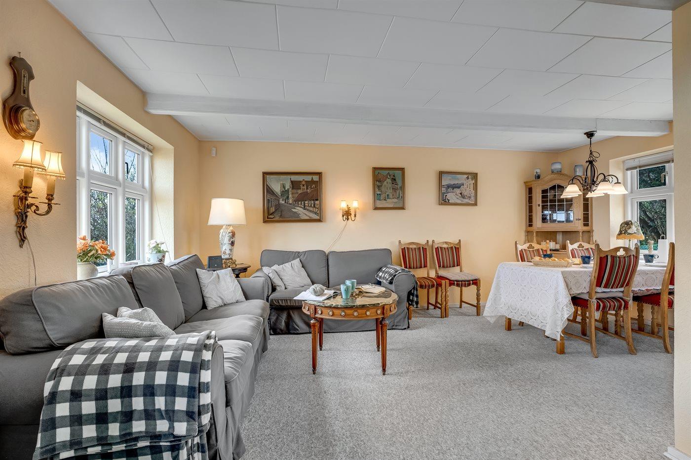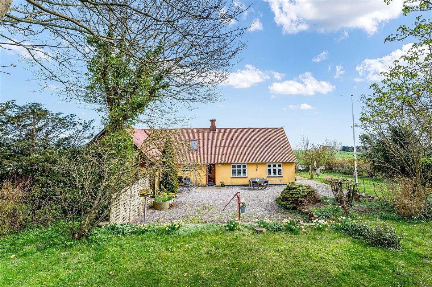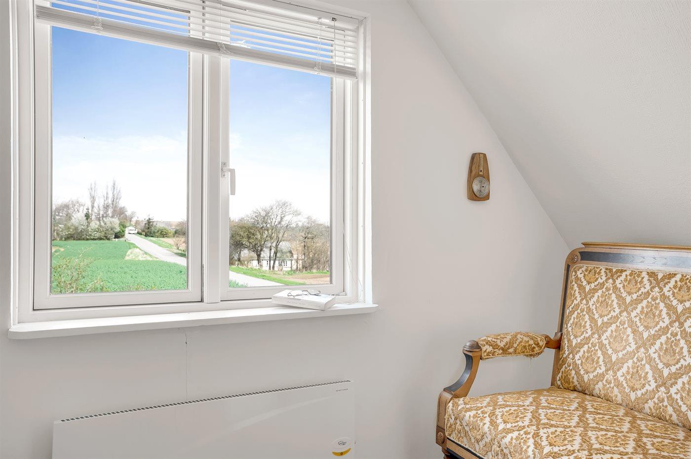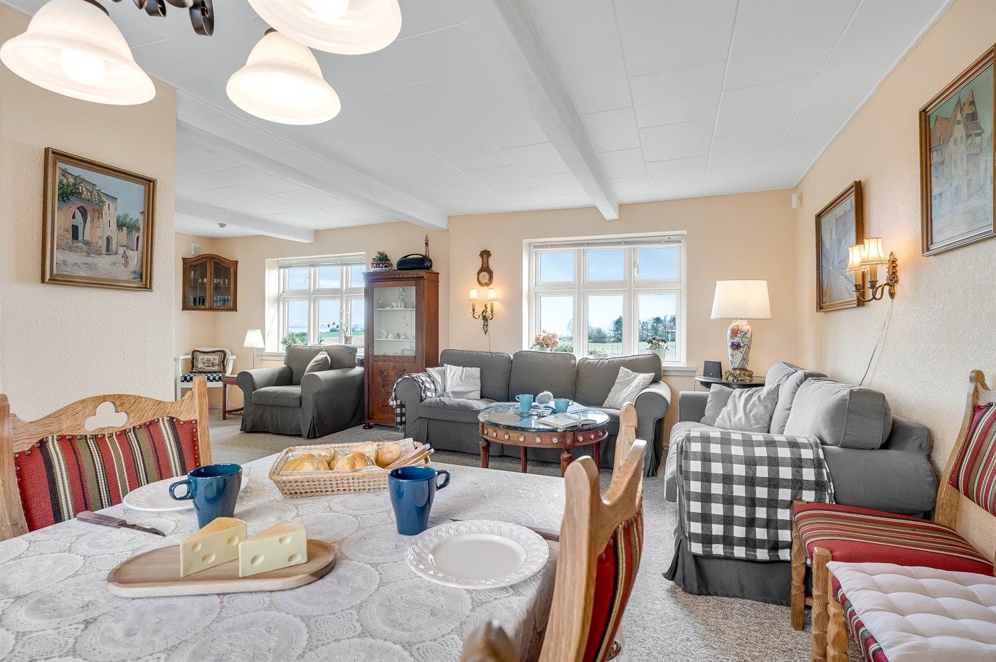 Et rummeligt sommerhus med havudsigt fra såvel hus som grund beliggende på landet omgivet af åbne marker i naturskønne omgivelser.