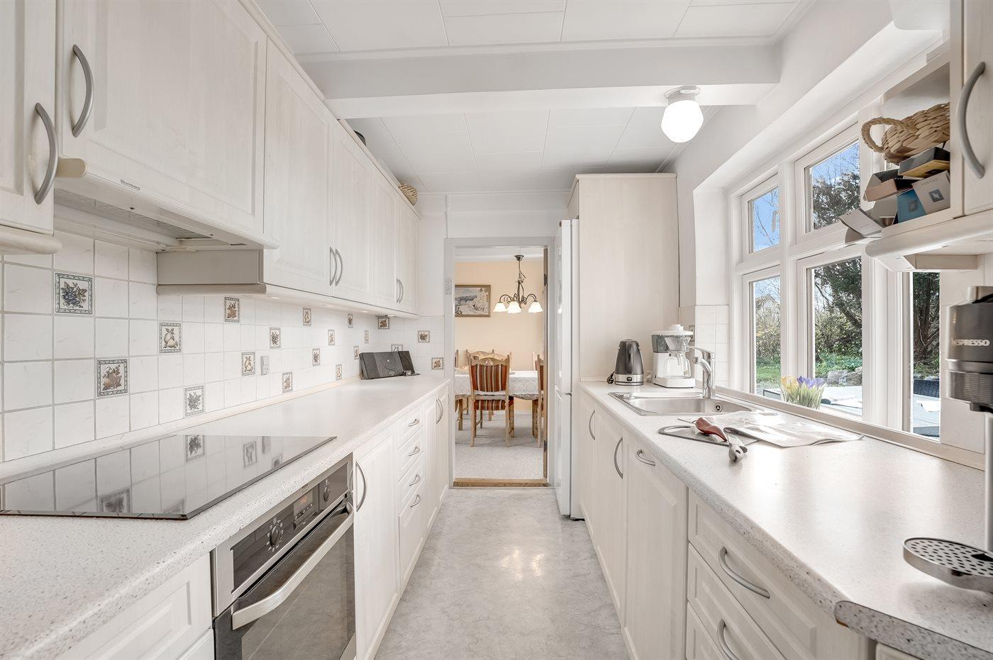 Køkkenet er udstyret med 1 køleskab. Der er 4 induktionskogeplader, varmluftovn, mikrobølgeovn samt opvaskemaskine.