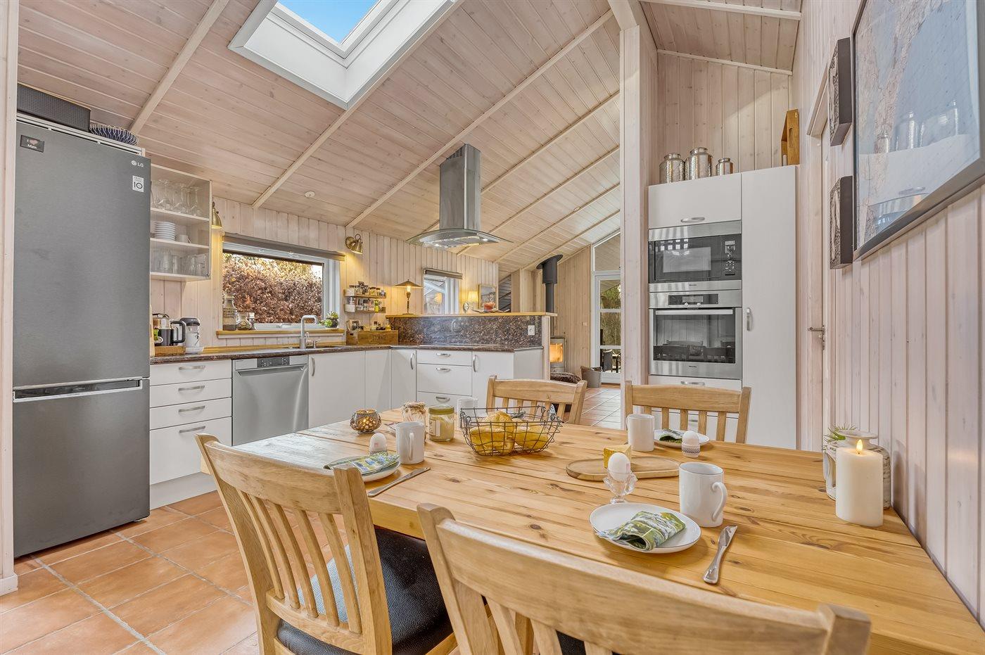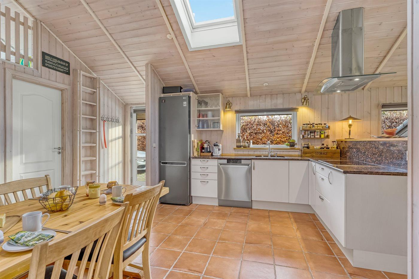 Køkkenet er udstyret med 1 køleskab. Der er 4 keramiske kogeplader, varmluftovn, mikrobølgeovn samt opvaskemaskine Der er gulvvarme i køkkenet.