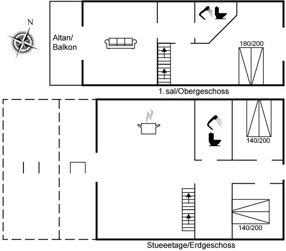 Dette dejlige sommerhus er bygget i to etager, hvor der i stueetagen findes et stort køkken-alrum med plads til madlavning og hygge indendørs samt udgang til den overdækkede terrasse, to soveværelser, et badeværelse og et bryggers. Førstesalen er indrettet med en stue, hvorfra der er udgang til en altan, et soveværelse ligeledes med udgang til en altan samt et badeværelse.
