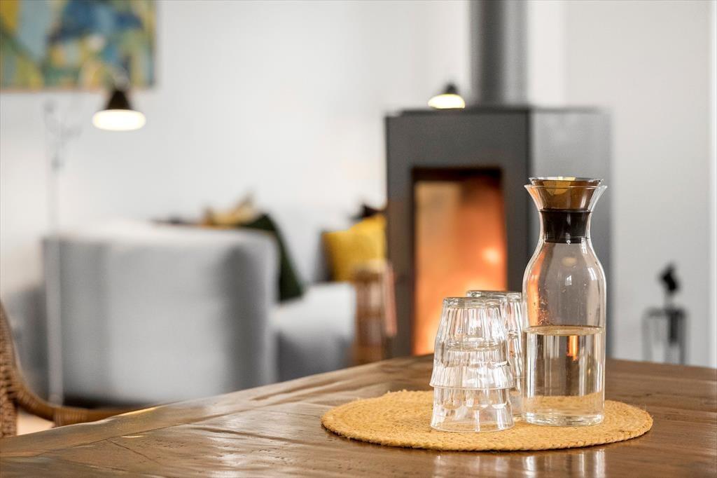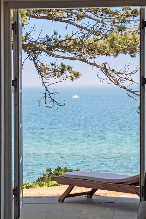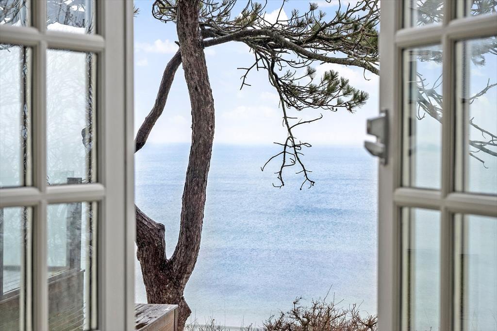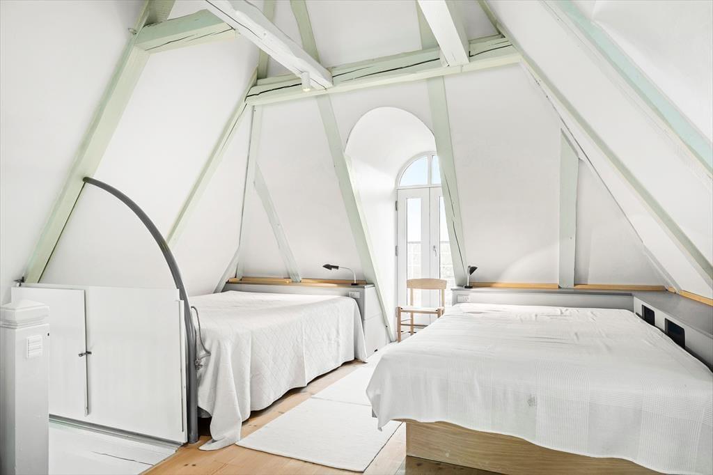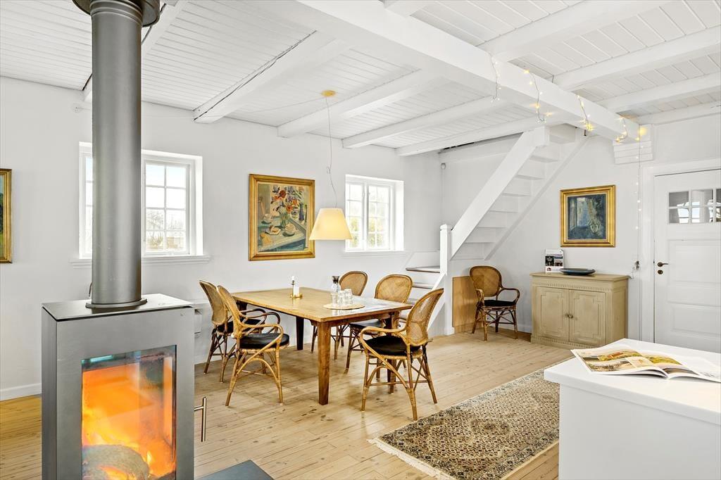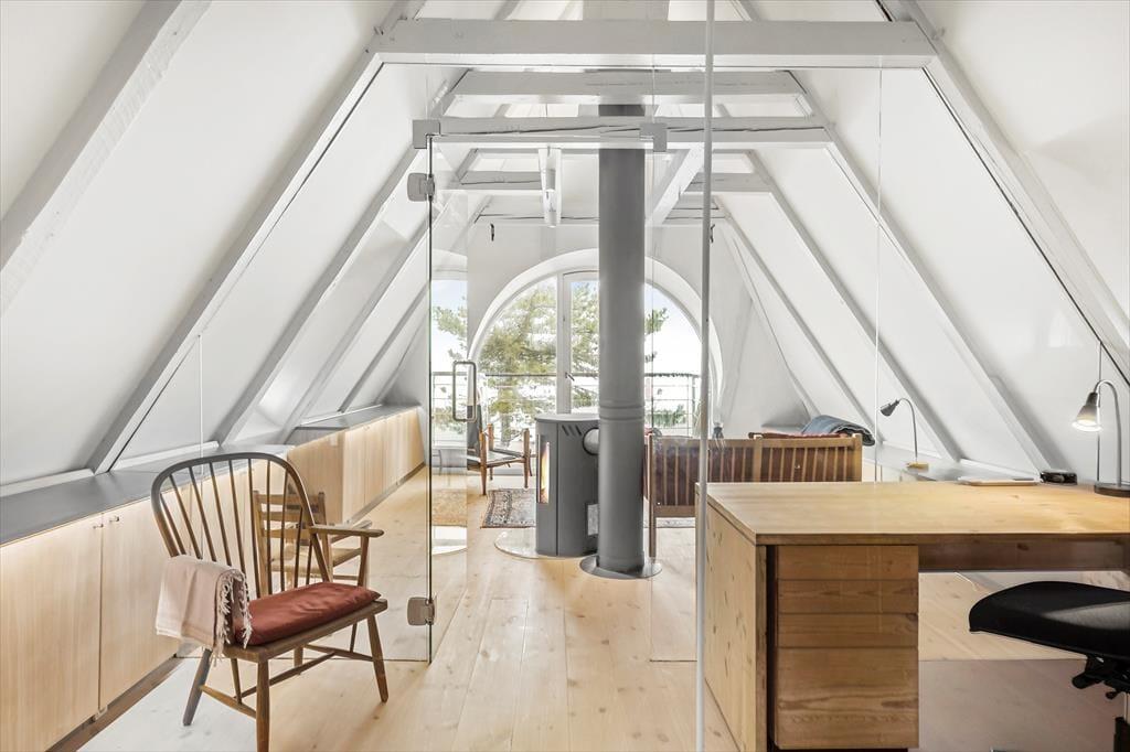 På førstesalen er rummet elegant opdelt af en glasvæg, hvilket giver en luftig og moderne atmosfære. Her finder du to dobbeltsenge og en ekstra opholdsstue med brændeovn samt udgang til en altan, hvor du kan vågne op til lyden af bølgerne og nyde solopgangen over havet.