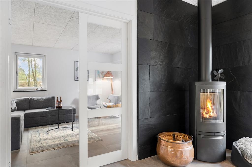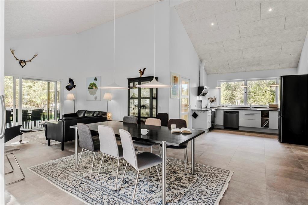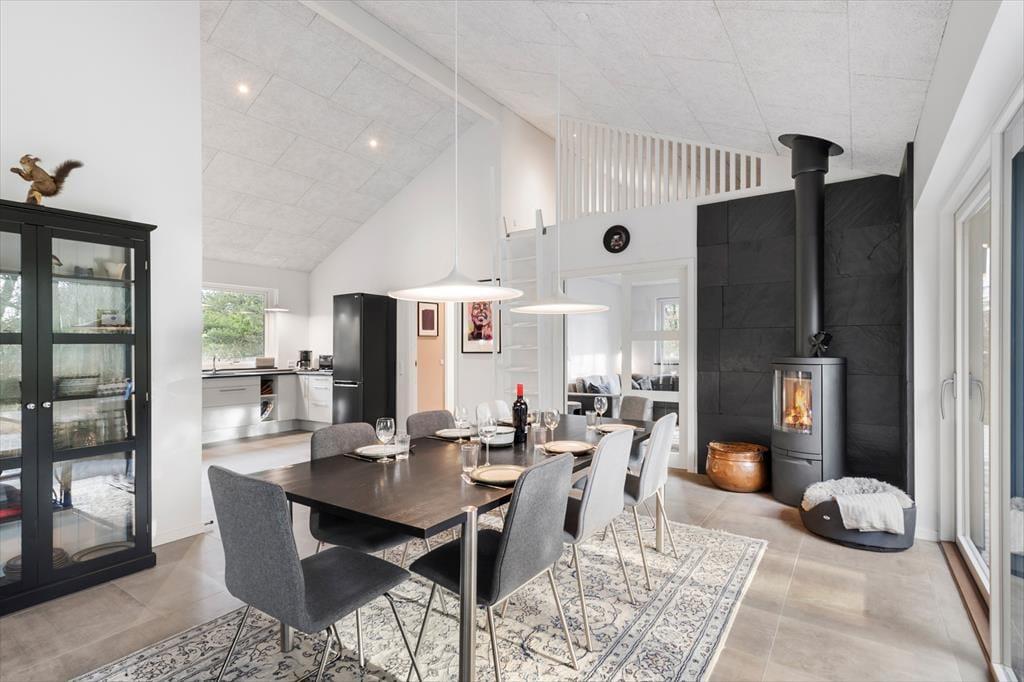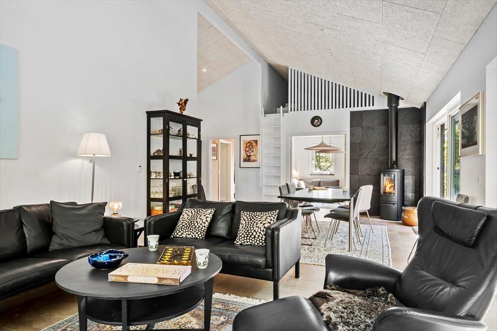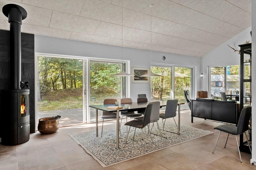 Det moderne design og den gennemtænkte planløsning sætter rammen om ferielivet i dette dejlige sommerhus. Huset byder på lyse opholdsrum med store vinduespartier, der lukker naturens lys og farver helt ind. Det åbne køkken-alrum er husets hjerte, hvor du kan samles med familien omkring madlavning og hyggelige middage. Den rummelige stue indbyder til afslapning med en god bog eller en film, mens brændeovnens varme spreder hygge. Med tre soveværelser og to badeværelser er der god plads til hele familien, og et praktisk bryggers gør det nemt at holde styr på hverdagslogistikken.
