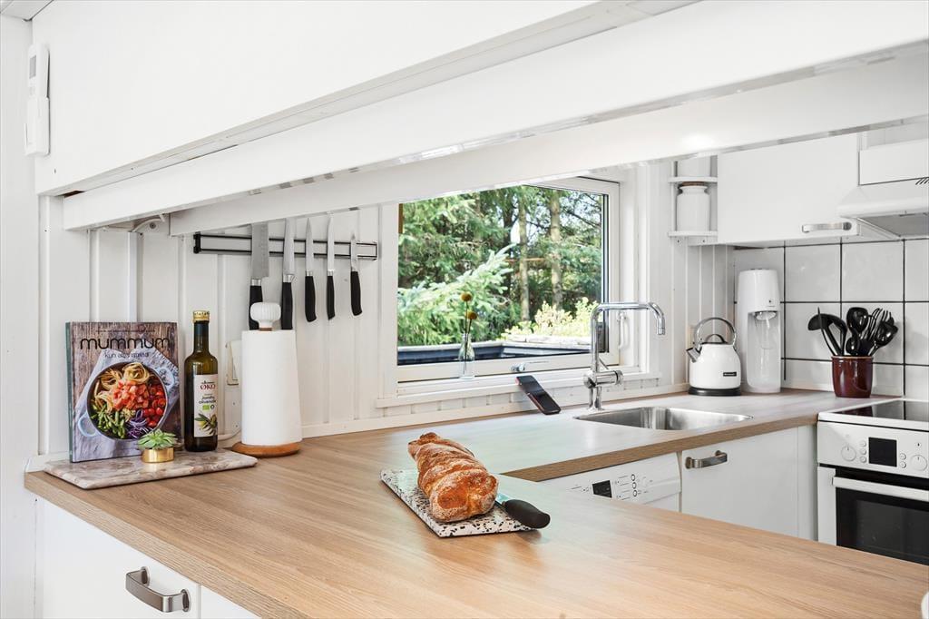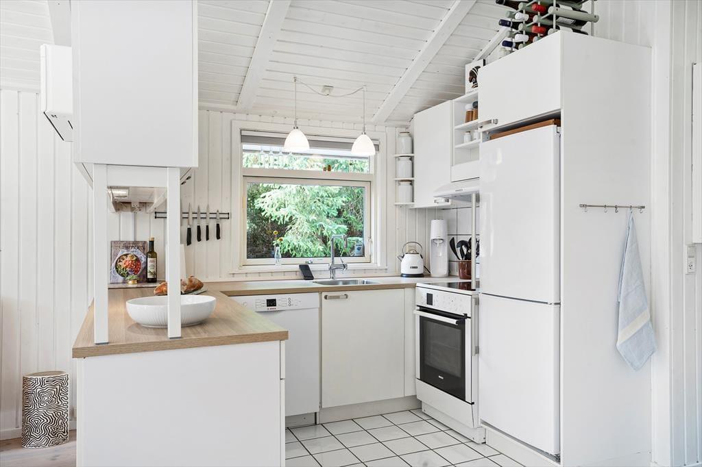 Sommerhuset er perfekt indrettet og ideelt til de, der sætter pris på kvalitets og en flot og gennemført stil. Her er lyst og venligt, og gennem de store vinduer i opholdsrummet har man et fint overblik over den skønne grund,der bl.a. rummer en dejlig grill plads. I den ene ende af huset ligger de 2 værelser og badeværelset, og i den anden ende finder man køkkenet og stuen samt det sidste værelse. I køkkenet er der god plads og alle nødvendige hjælpemidler for en afslappende ferie, og i stuen kan man varme sig ved pillefyret, hvortil man kan købe piller ved huset. Bemærk, at tv’et har dansk TV2. Sommerhuset er klassificeret som allergivenligt, dyr har derfor ikke adgang og overalt er der flise-og trægulve.
