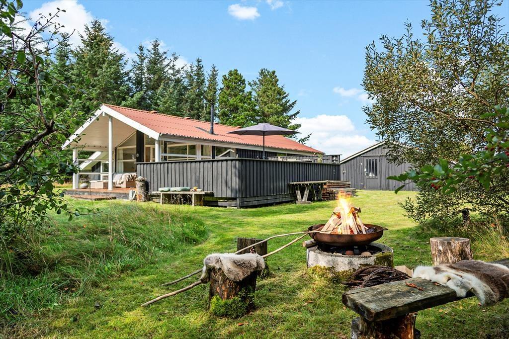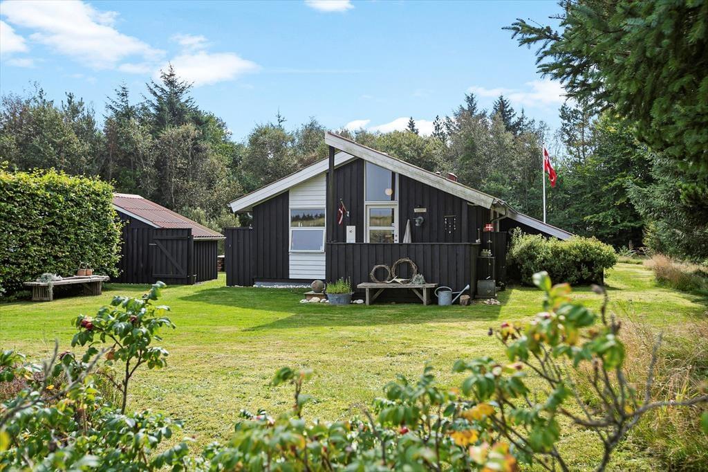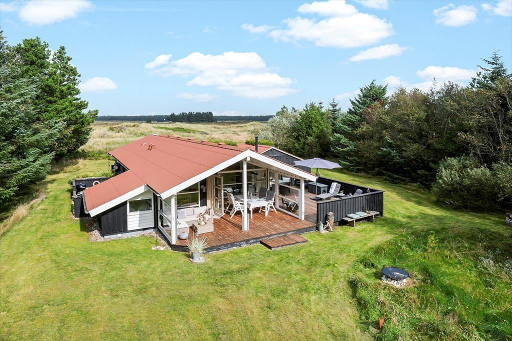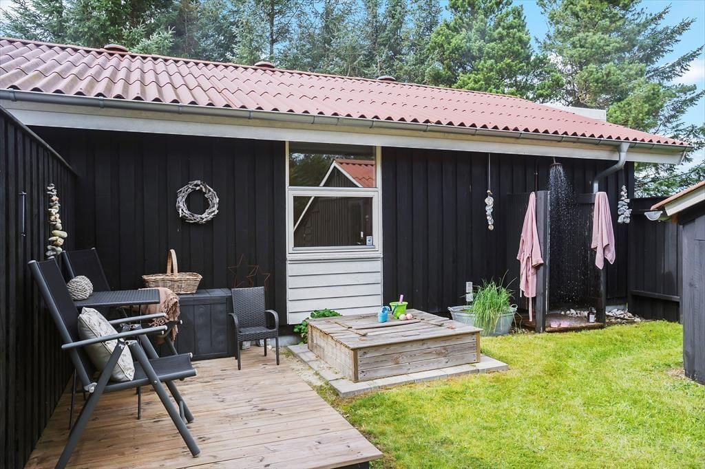 Den store naturgrund er hyggelig og dejligt afskærmet, så man virkelig får mulighed for at slappe af. På træterrassen, som vender mod syd, er der også en lille overdækket del, hvor man kan sidde når duggen falder. Modsat mod nord ved indgangen er en skøn morgenterrasse med fin afskærmning for vinden, herfra kan man fint se ud over klitlandskabet. Efter en tur i Vesterhavets bølger er det skønt med en tur under den udendørs bruser.