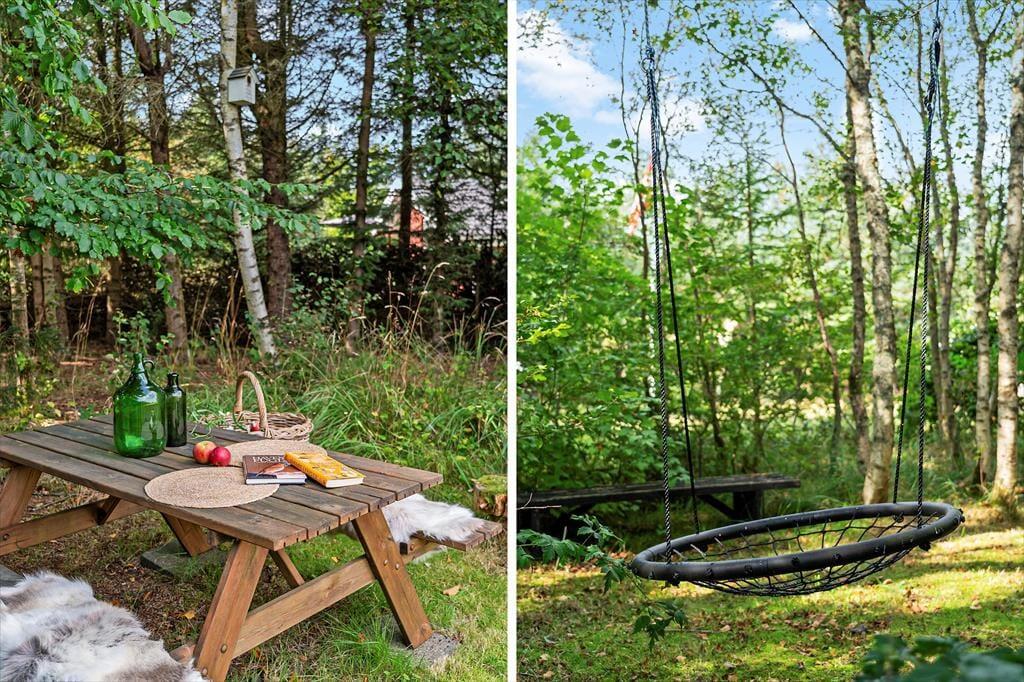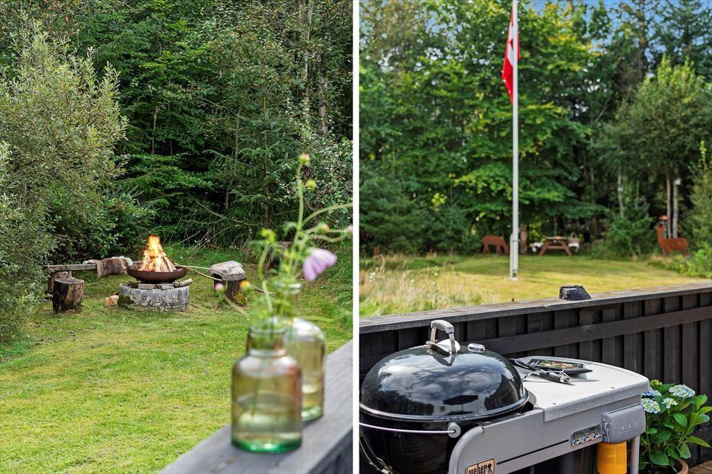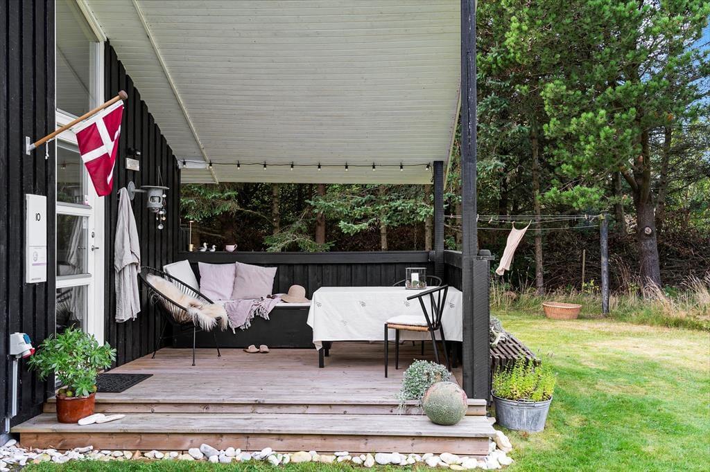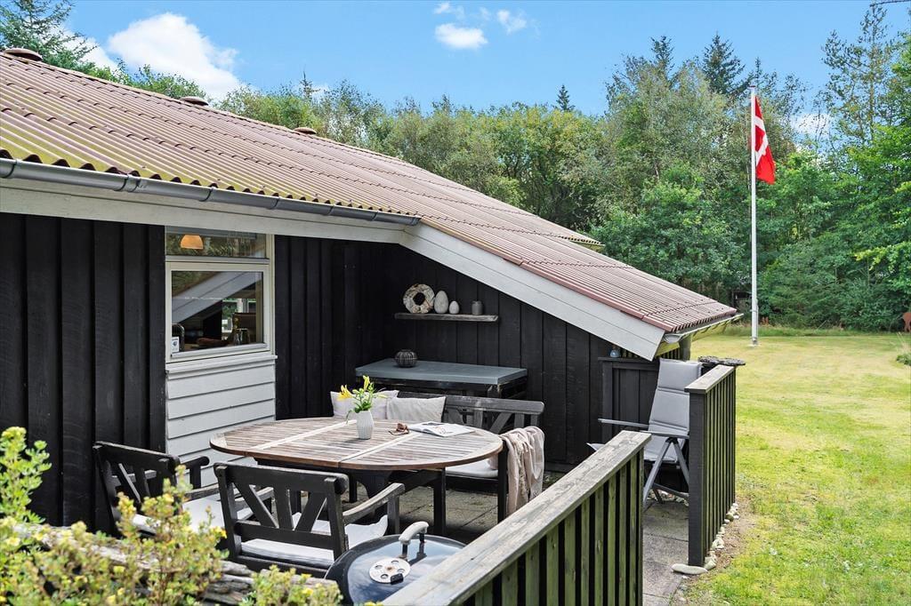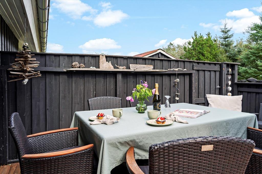 Den store naturgrund er hyggelig og dejligt afskærmet, så man virkelig får mulighed for at slappe af. På træterrassen, som vender mod syd, er der også en lille overdækket del, hvor man kan sidde når duggen falder. Modsat mod nord ved indgangen er en skøn morgenterrasse med fin afskærmning for vinden, herfra kan man fint se ud over klitlandskabet. Efter en tur i Vesterhavets bølger er det skønt med en tur under den udendørs bruser.