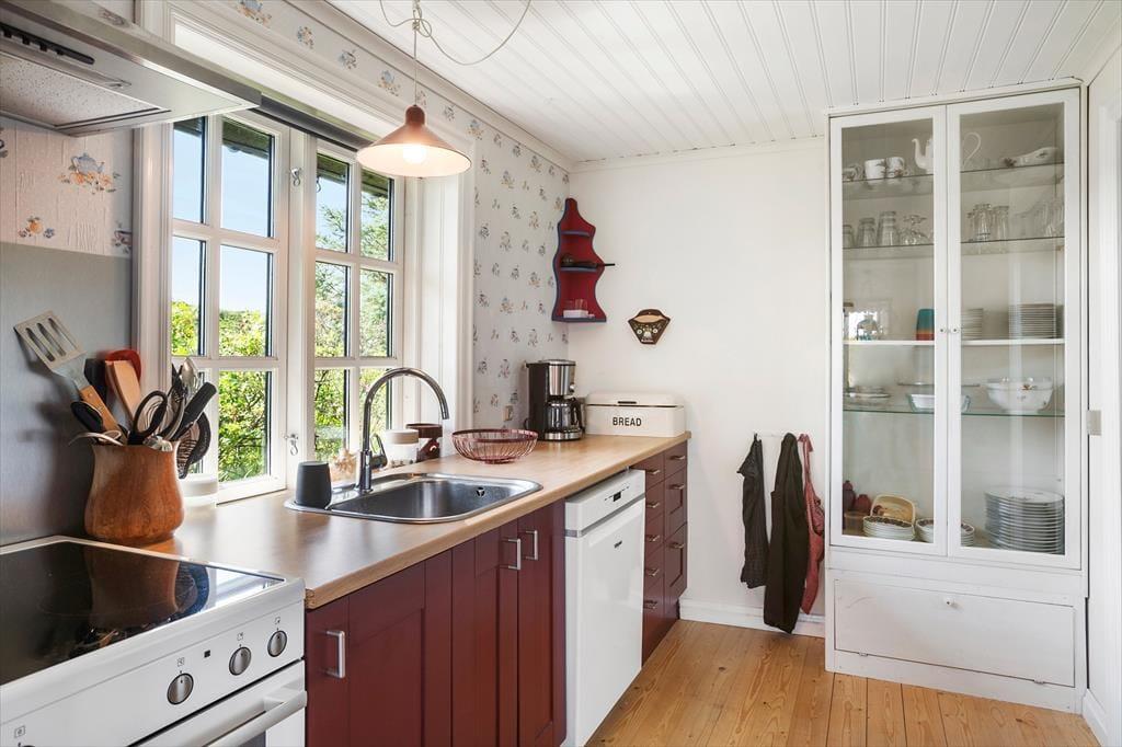 Set udefra har træhuset ikke ændret sig det store siden opførelsen i 1967, og det ser nærmest ud til at være smeltet sammen med det kuperede klitlandskab. At huset er fulgt med tiden bliver dog ganske tydeligt inden døre, hvor rummene fremstår lyse og med flere moderne detaljer – inklusiv opvaskemaskine i køkkenet, fladskærms-tv med Chromecast i stuen og god wi-fi-forbindelse. Et pænt brusebadeværelse og et ekstra toilet hører med til planløsningen foruden tre soveværelser, der i alt har sengepladser til fem personer. Køkkenet ligger ved siden af stuen, så når kaffen er færdigbrygget, eller aftensmaden står klar, er det nemt at bære ind til spisebordet eller sofaen nær brændeovnen.