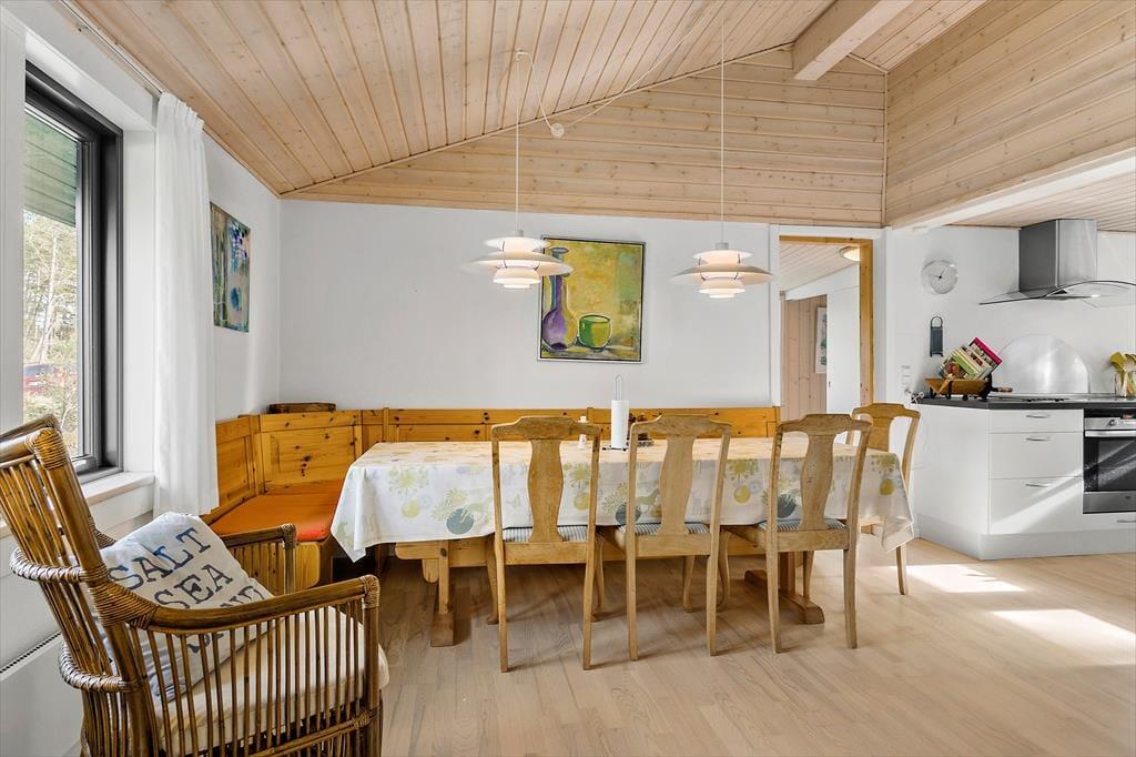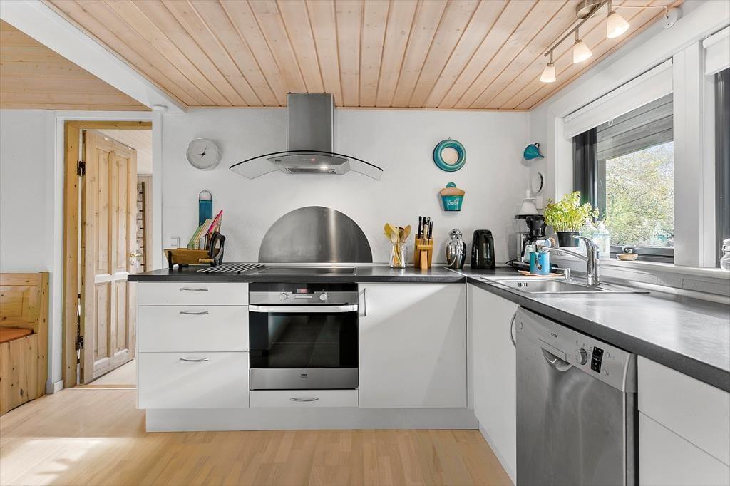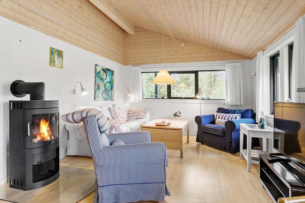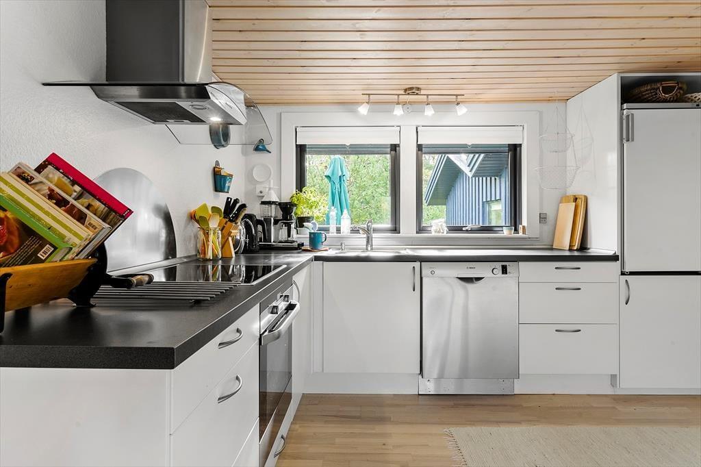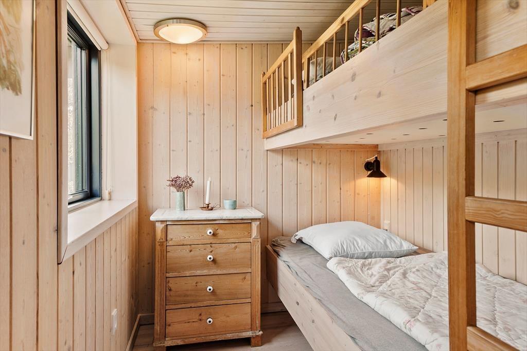 Med sin torden blå træfacade og sit grønne tag emmer huset af autentisk sommerhusstemning, hvilket passer perfekt ind i landskabet. Huset fremstår meget velholdt, og indenfor er der en varm og indbydende atmosfære med mange trædetaljer og hyggelige opholdspladser. Naturligt lys får I også i generøse mængder takket være de mange vinduespartier. Samværet i familiens skød får fine betingelser i det hyggelige, højloftede opholdsmiljø med køkken og stuer i åben forbindelse. Her er der også en brændeovn, som luner godt, hvis aftenerne skulle blive kølige. Huset har plads til otte personer fordelt på fire soveværelser: et værelse med dobbeltseng, et med to enkeltsenge og to værelser med køjesenge. Endelig er der på praktisk vis to badeværelser, så risikoen for kø til bruseren om morgenen er minimal. Bemærk der er en lille trappe indvendigt i huset på 3 trin.