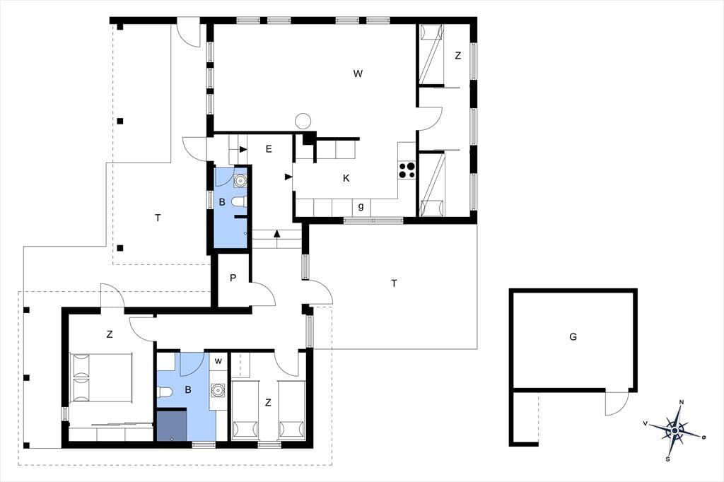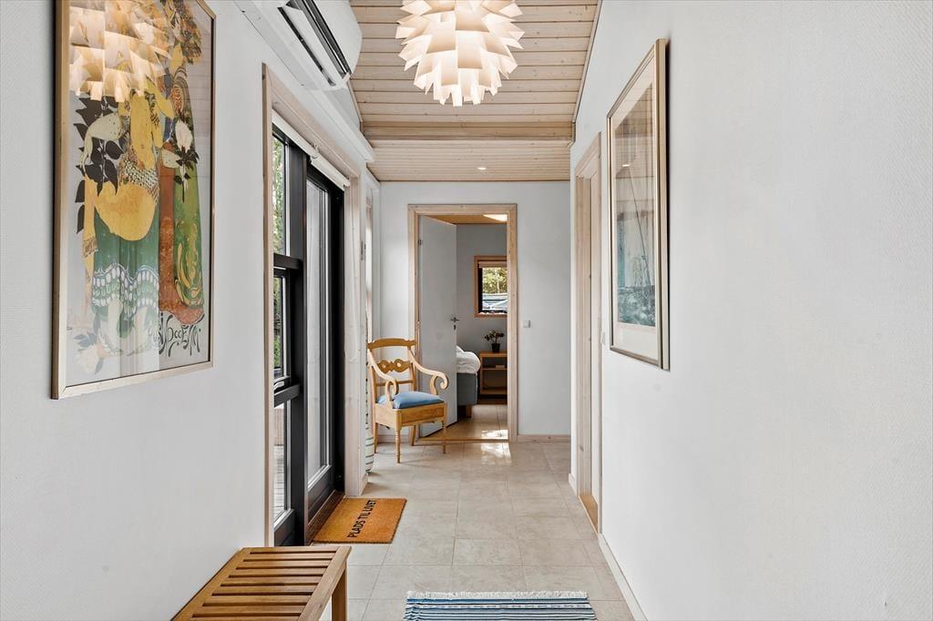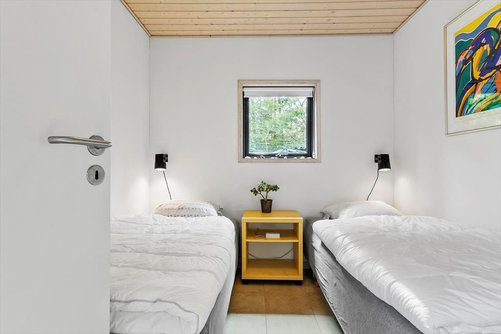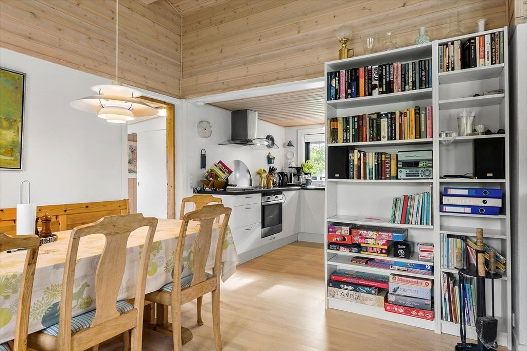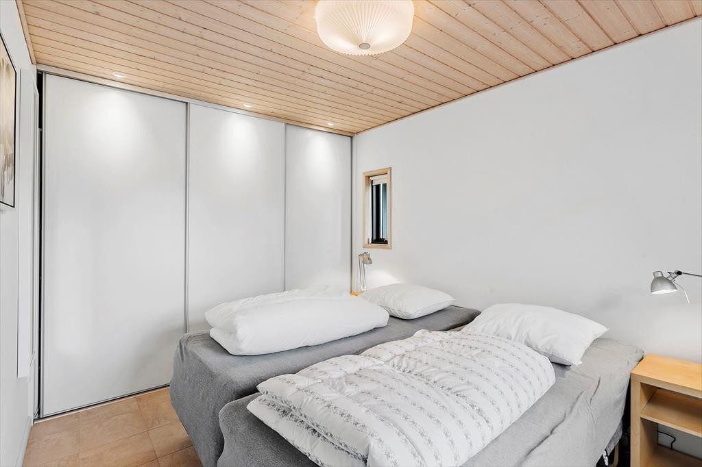 Med sin torden blå træfacade og sit grønne tag emmer huset af autentisk sommerhusstemning, hvilket passer perfekt ind i landskabet. Huset fremstår meget velholdt, og indenfor er der en varm og indbydende atmosfære med mange trædetaljer og hyggelige opholdspladser. Naturligt lys får I også i generøse mængder takket være de mange vinduespartier. Samværet i familiens skød får fine betingelser i det hyggelige, højloftede opholdsmiljø med køkken og stuer i åben forbindelse. Her er der også en brændeovn, som luner godt, hvis aftenerne skulle blive kølige. Huset har plads til otte personer fordelt på fire soveværelser: et værelse med dobbeltseng, et med to enkeltsenge og to værelser med køjesenge. Endelig er der på praktisk vis to badeværelser, så risikoen for kø til bruseren om morgenen er minimal. Bemærk der er en lille trappe indvendigt i huset på 3 trin.