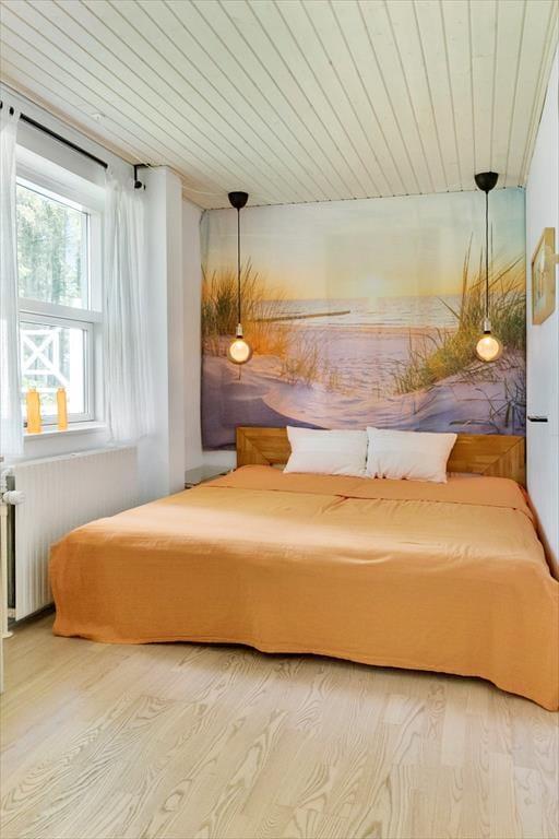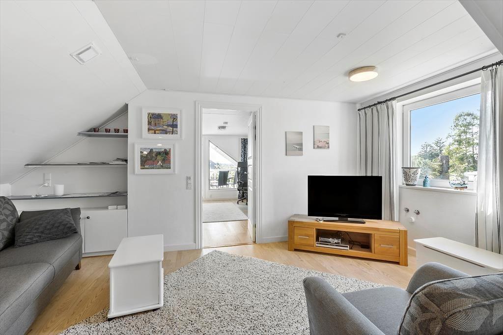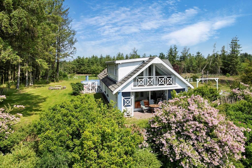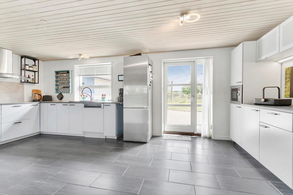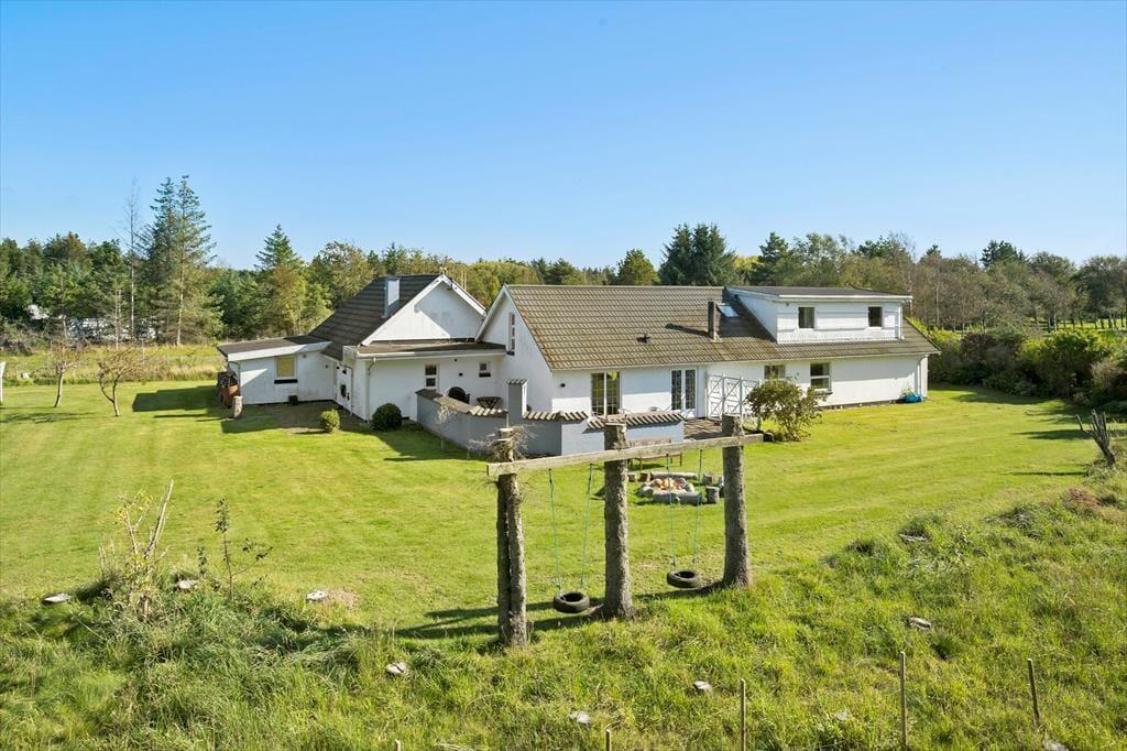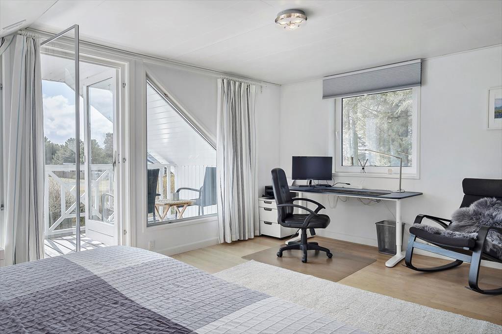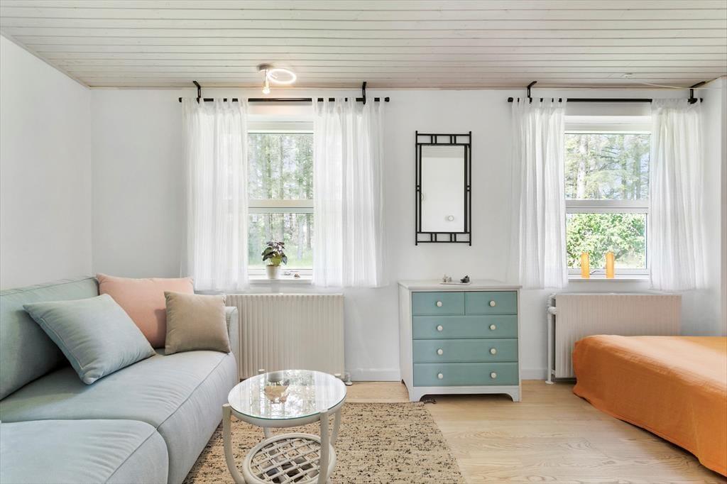 Sommerhuset byder dig velkommen med sine lyse og luftige rum. Den ene stue er indrettet med store vinduespartier, der inviterer det smukke naturlige lys indenfor og giver en fantastisk udsigt over det omkringliggende landskab. Her kan du synke ned i en behagelig sofa, mens du nyder synet af den skiftende himmel og de grønne marker. Den anden stue, som er en hyggelig tv-stue, er perfekt til filmaftener eller afslapning med en god bog. Køkkenet er åbent og rummeligt, hvilket gør det nemt at samles om madlavningen. Efter en lang dag kan du trække dig tilbage til et af husets komfortable soveværelser, der alle er indrettet med henblik på afslapning og ro.