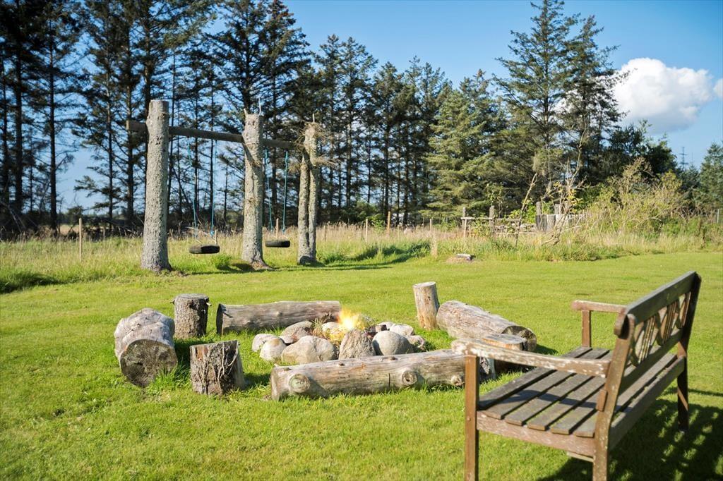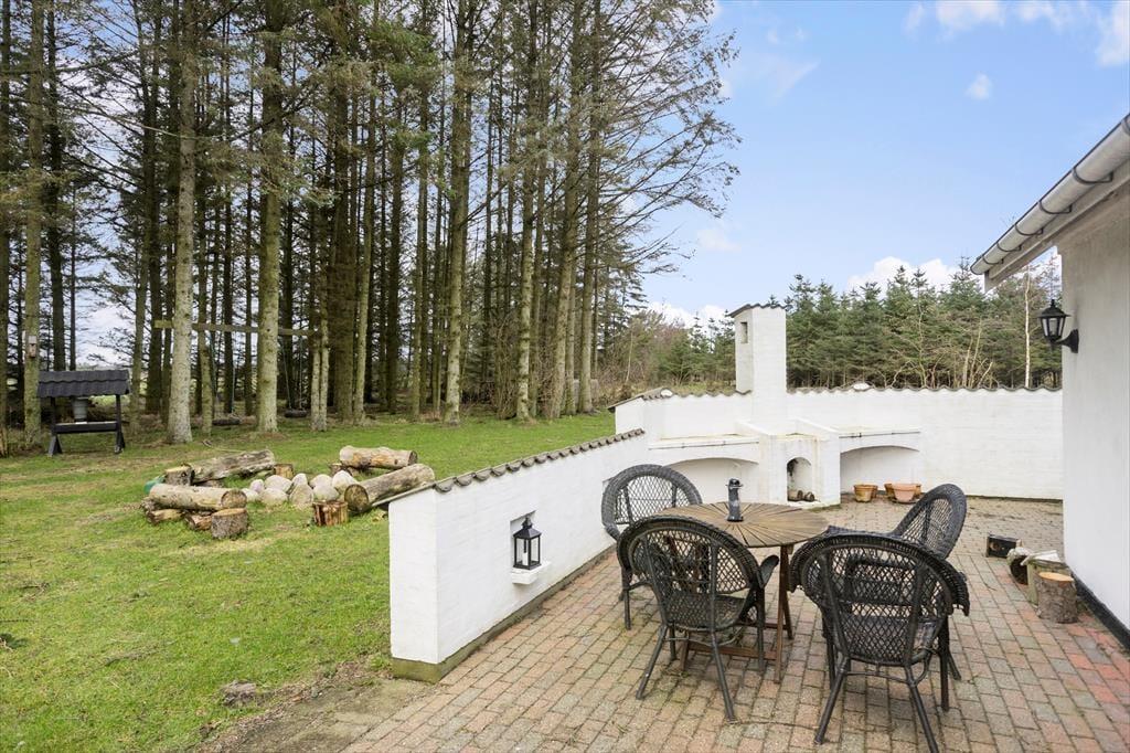 Udendørsområdet omkring sommerhuset er en sand oase af fred og ro. Den lukkede grund sikrer, at både børn og husdyr kan lege frit og sikkert. Terrassen er det ideelle sted at starte dagen med en kop kaffe, mens du nyder solopgangen og lydene fra naturen. Når solen står højest på himlen, kan du tage et hvil i en liggestol og lade dig varme af strålerne, eller måske nyde en frokost i skyggen. Den store have indbyder til leg og spil, og om aftenen kan I tænde op i grillen og tilberede en lækker middag under åben himmel. Den rolige atmosfære og den smukke udsigt over landskabet giver en følelse af fuldstændig fred og afsondrethed.
