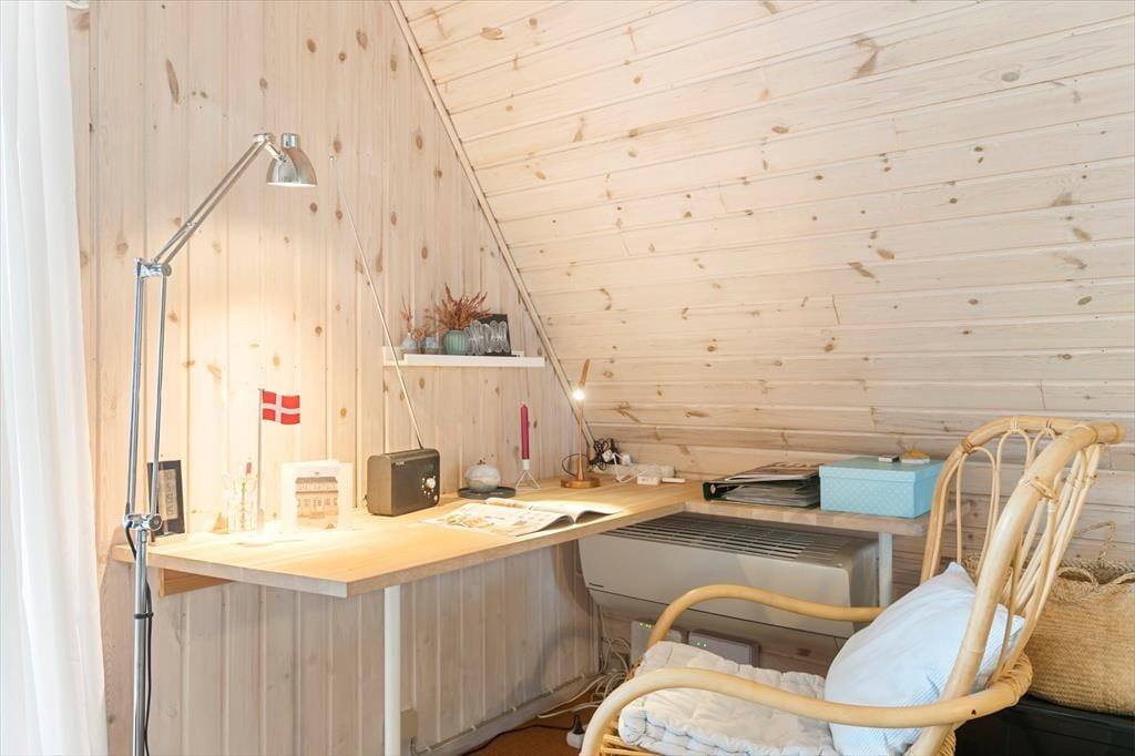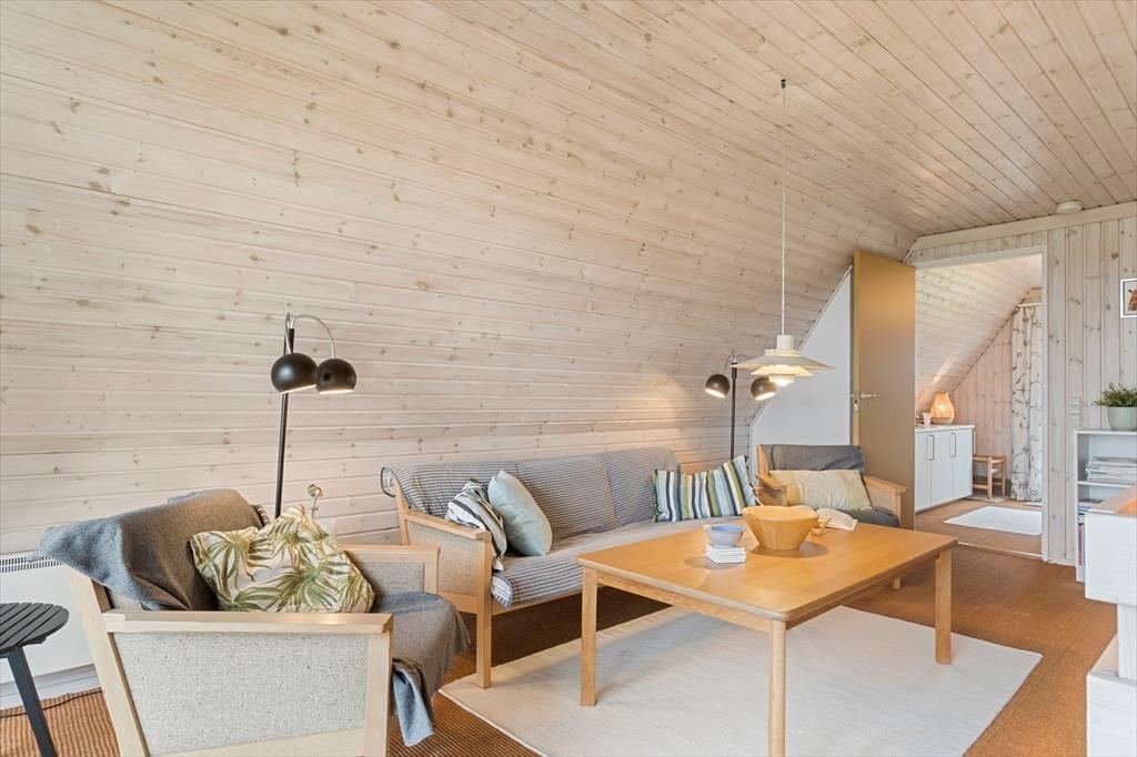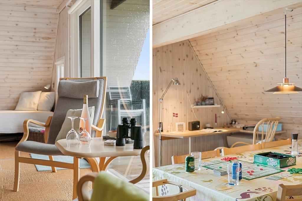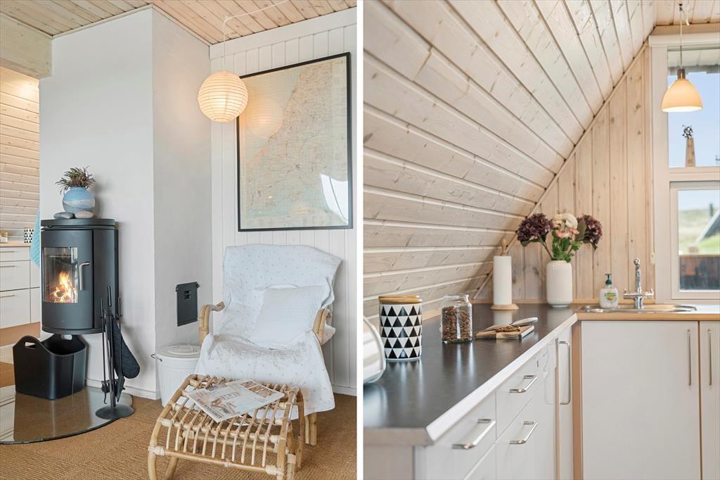 Indenfor mødes du af et lyst og indbydende opholdsrum med store vinduespartier, der trækker naturens grønne farver og lyset ind. Brændeovnen skaber en varm og hyggelig atmosfære, perfekt til stille stunder med en god bog eller en kop kaffe. Stuen er indrettet med komfortable møbler, der indbyder til afslapning og samvær. De tre soveværelser – to med enkeltsenge og ét med dobbeltseng – er holdt i rolige farver og enkle linjer, hvilket understøtter husets afslappede stemning. Det ene værelse har desuden en alkove, hvor børnene kan hygge sig med film eller spil.
