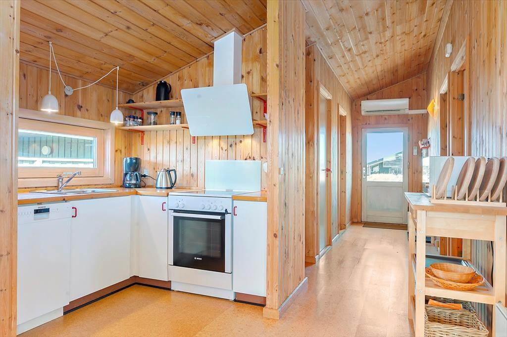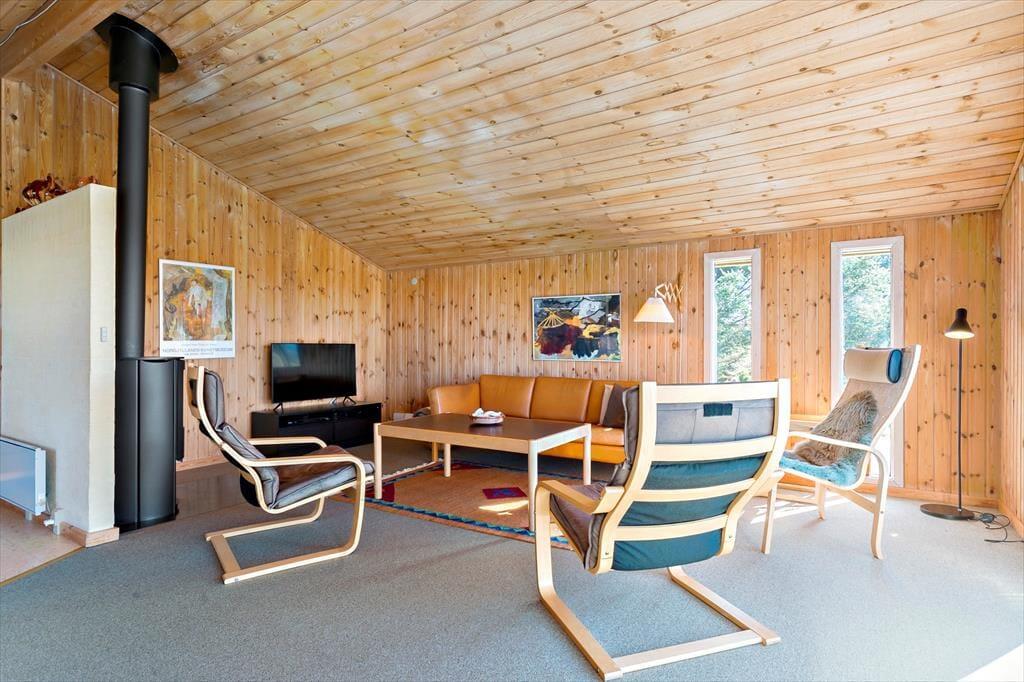 Når du træder indenfor, bliver du mødt af en hyggelig stue, hvor den charmerende brændeovn skaber en varm og indbydende stemning. Her kan du samles med familie og venner, slappe af og nyde hinandens selskab efter en dag ude i naturen. Sommerhuset er indrettet med plads til hygge og samvær, og de åbne rum gør det let at bevæge sig rundt og nyde ferien. Det åbne køkken og spisepladsen giver mulighed for, at alle kan være med, når der laves mad, og du kan roligt lade opvasken vente, mens du slapper af ved pejsen.