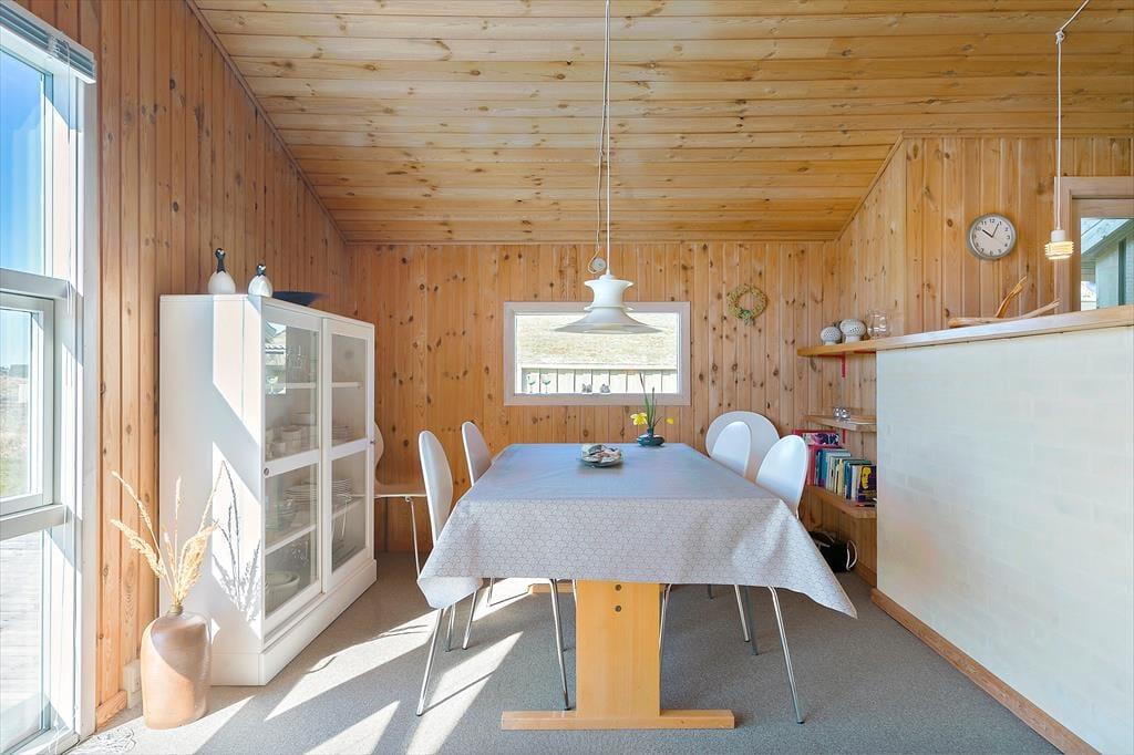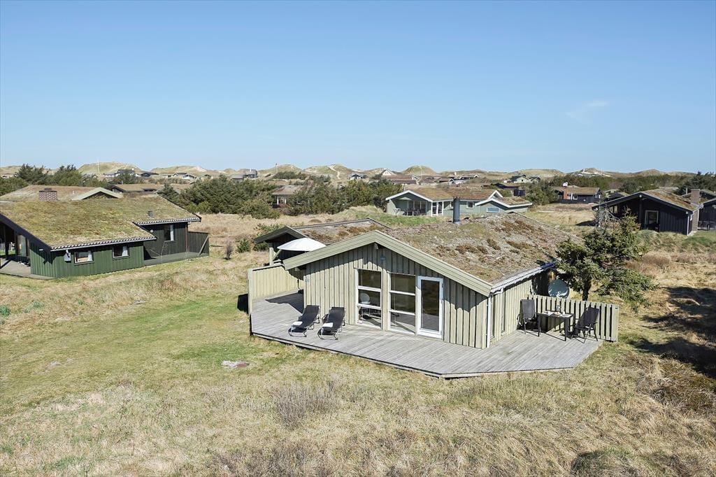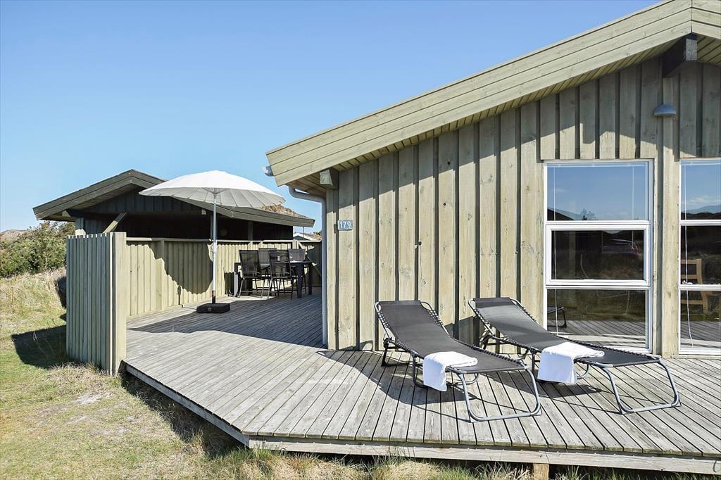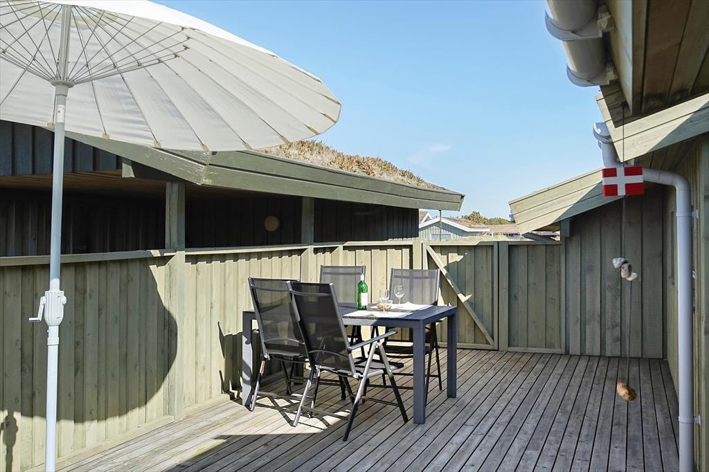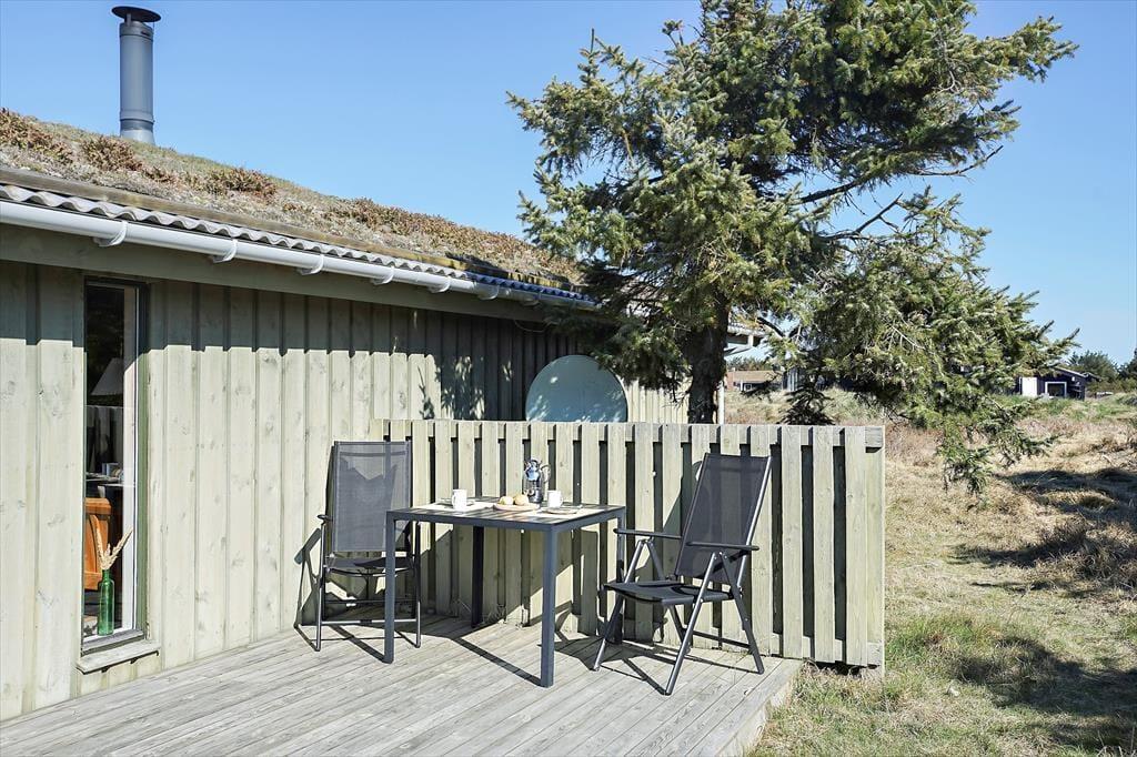 Udenfor finder du flere dejlige terrasser rundt om huset, hvor du kan følge solens gang hele dagen. Den store, sydvendte terrasse er perfekt til middag i solen, mens de mere afskærmede områder giver plads til at trække sig tilbage med en god bog. Sommerhuset ligger i smørhullet mellem Blokhus og Rødhus, og du har nem adgang til det omkringliggende landskab. Terrassen omkring huset giver masser af muligheder for at finde et hyggeligt hjørne, hvor du kan nyde roen og lydene fra naturen – og måske en stille aften med et glas vin i hånden.