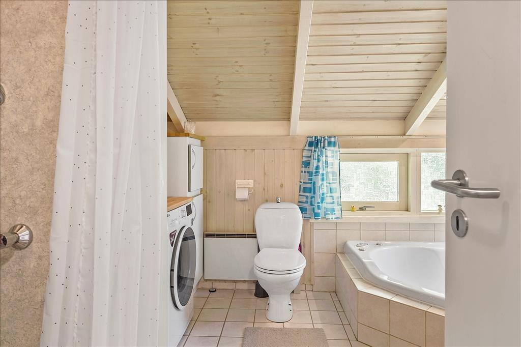Indendørs byder sommerhuset på en hyggelig og rummelig stue, hvor hele familien kan samles omkring brændeovnen og nyde et spil brætspil eller en god film. Her er plads til både afslapning og fælles aktiviteter. De store vinduer giver et dejligt lysindfald og en skøn udsigt til naturen omkring huset. Køkkenet er praktisk indrettet, så I nemt kan lave måltider sammen. Når maden er klar, kan I samles om spisebordet, som er perfekt til familiens måltider. Sommerhusets badeværelse er også en oplevelse i sig selv, hvor I kan forkæle jer selv med en tur i saunaen eller slappe af i spabadet efter en aktiv dag ude i naturen.