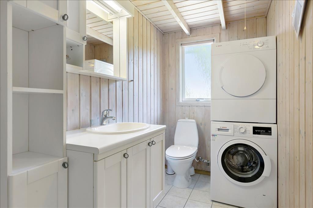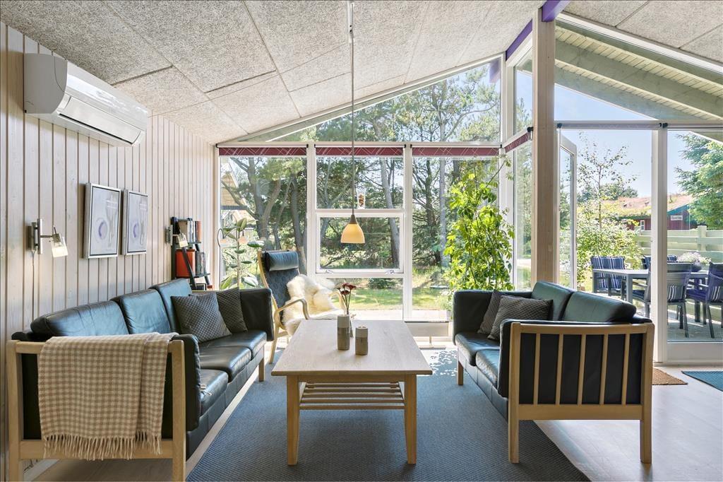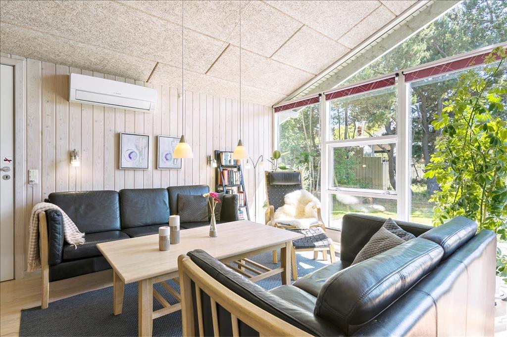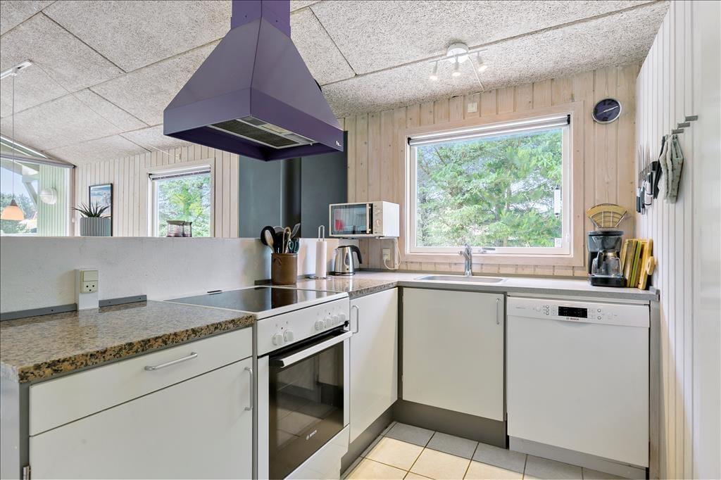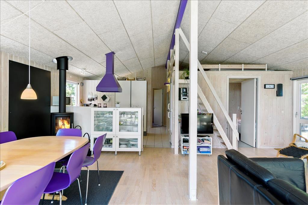 Når du træder indenfor i dette sommerhus, vil du hurtigt mærke den behagelige atmosfære, som breder sig fra det åbne opholdsrum. Stuen har store vinduespartier, der giver et lysfyldt og luftigt miljø, og den åbne planløsning skaber en sammenhængende og indbydende ramme. Her er der masser af plads til både afslapning og samvær. Den hyggelige brændeovn er et fantastisk midtpunkt, og du kan forestille dig, hvordan den skaber varme og stemning på en kølig efterårs- eller vinterdag. Køkkenet er funktionelt og godt indrettet, og der er rig mulighed for at samles om madlavningen eller nyde et måltid sammen i den store spiseafdeling.