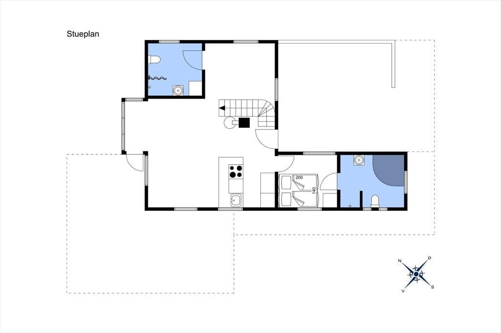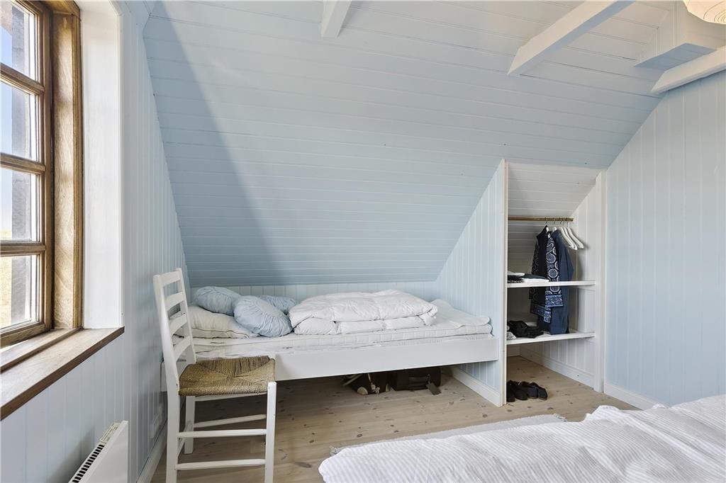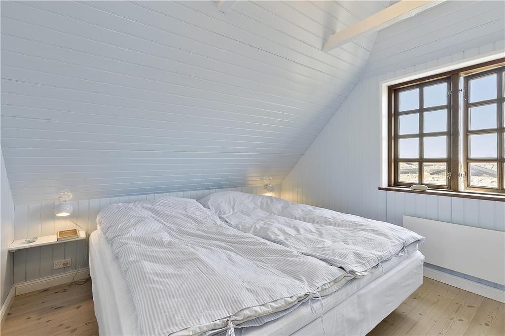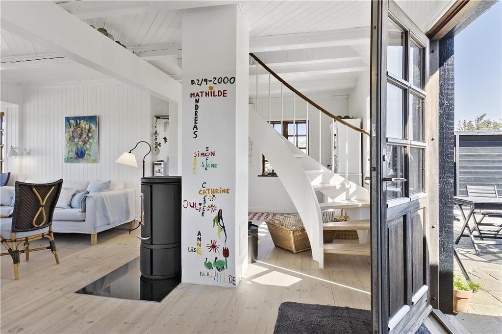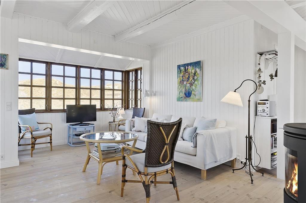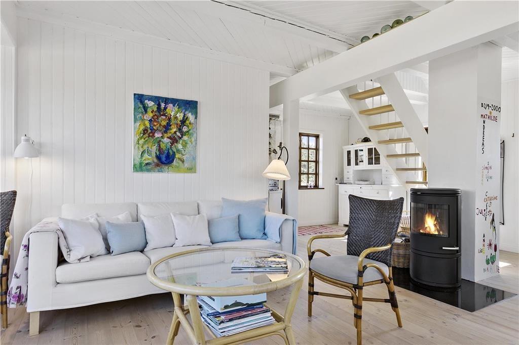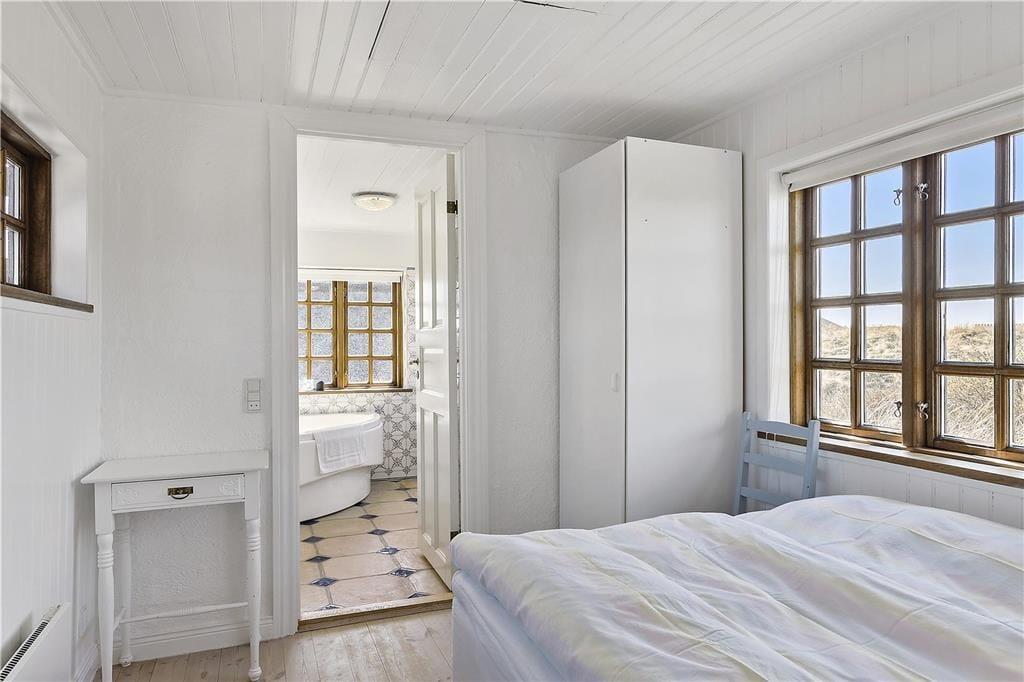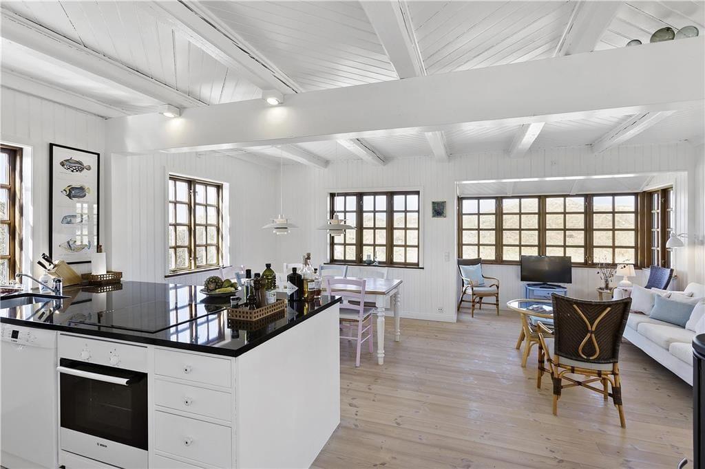 Indenfor bliver du mødt af en lys og indbydende atmosfære, hvor store vinduespartier bringer naturen tættere på. Stuen er både hyggelig og rummelig, og her er plads til at slappe af foran brændeovnen efter en lang dag ved stranden. Køkkenet er funktionelt og åbent, så du kan nyde samværet med dine nærmeste, mens du tilbereder måltider. Huset har en dejlig indretning, der appellerer til både afslapning og socialt samvær, og de rolige farver og lyse rum skaber den perfekte ferieoase, hvor du kan lade op.