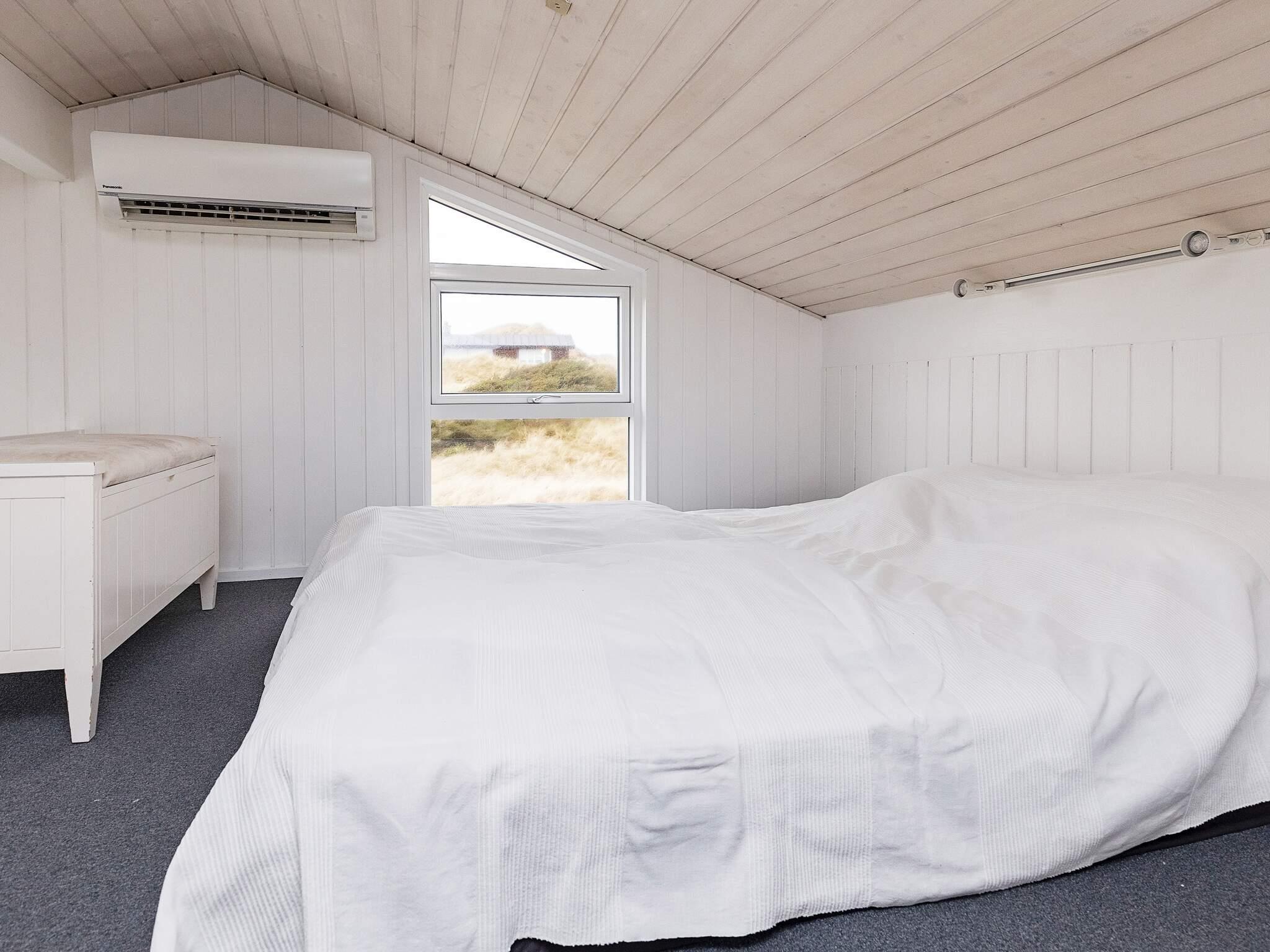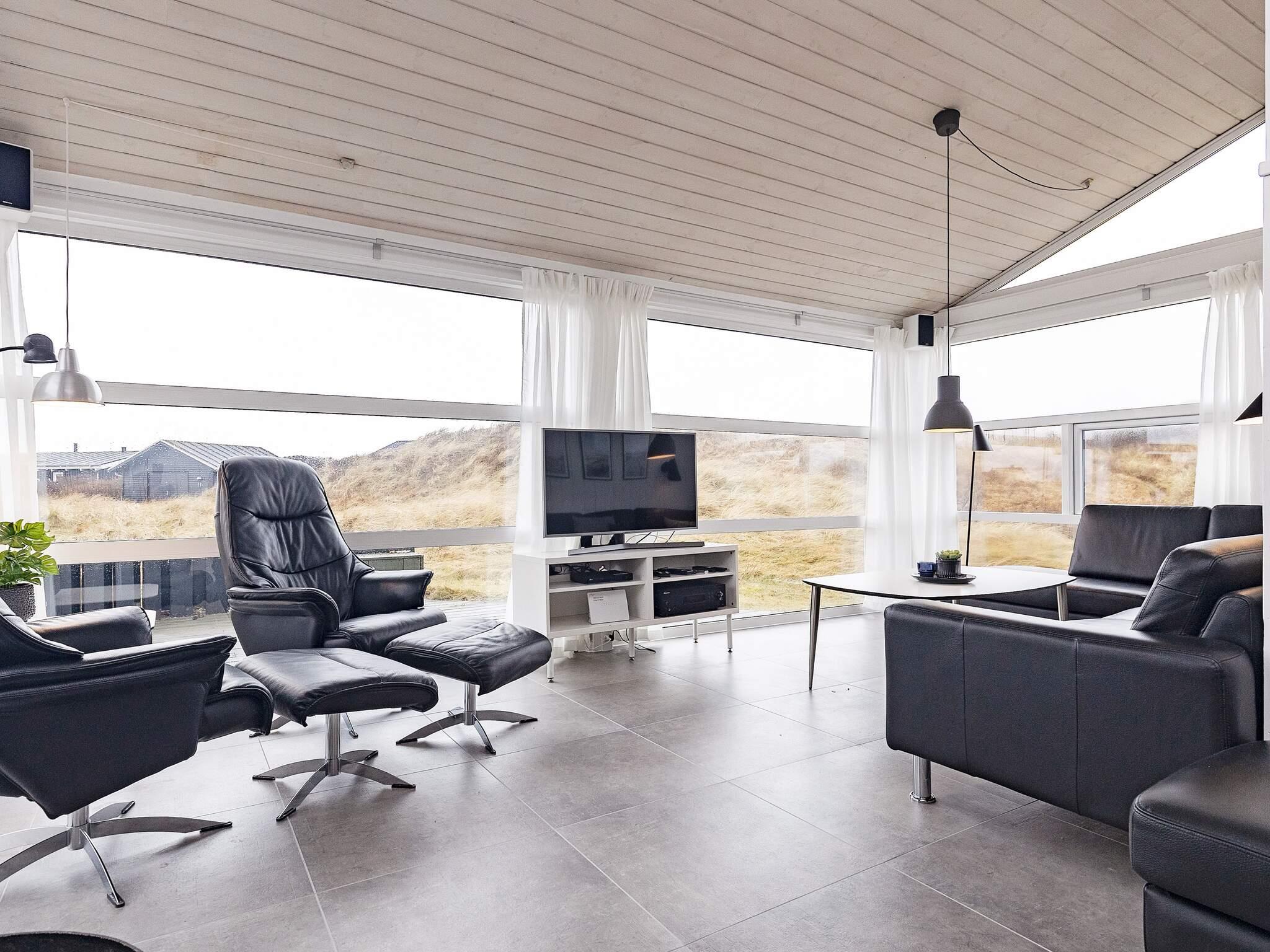 Indretningen er lys og moderne i den kendte sommerhusstil. Der er flere store vinduespartier, hvilket sikrer et flot lysindfald dagen igennem og som sikrer udsigt over klitområdet og et ganske lille havkig.