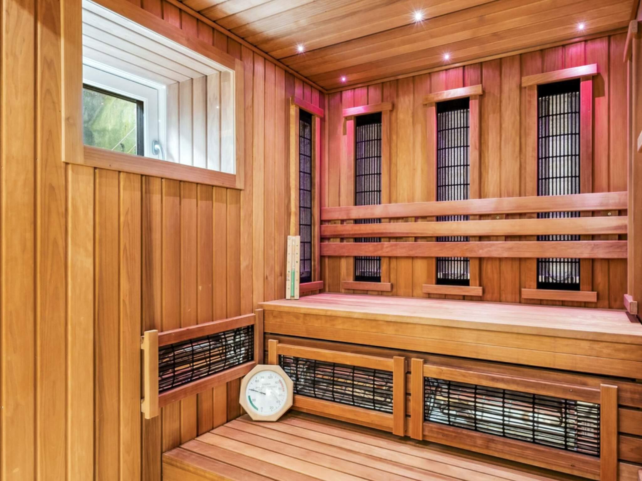 Huset har fire stilfulde soveværelser - tre med dobbeltsenge og et med to dobbeltsenge - samt tre moderne badeværelser, et med badekar og et andet med dampbruser. Nedenunder kan gæsterne nyde en privat hjemmebiograf og et skønt wellness-område med infrarød sauna, dampbad og koldtvandsbassin. Huset har også gulvvarme i både stueetagen og kælderen og drives af en effektiv luft-til-vand-varmepumpe.