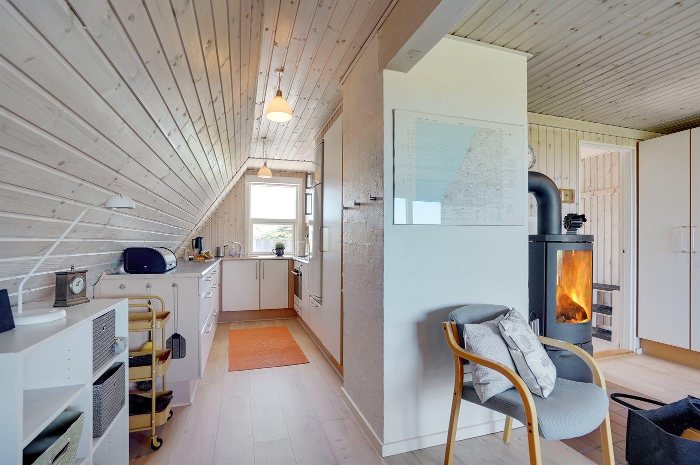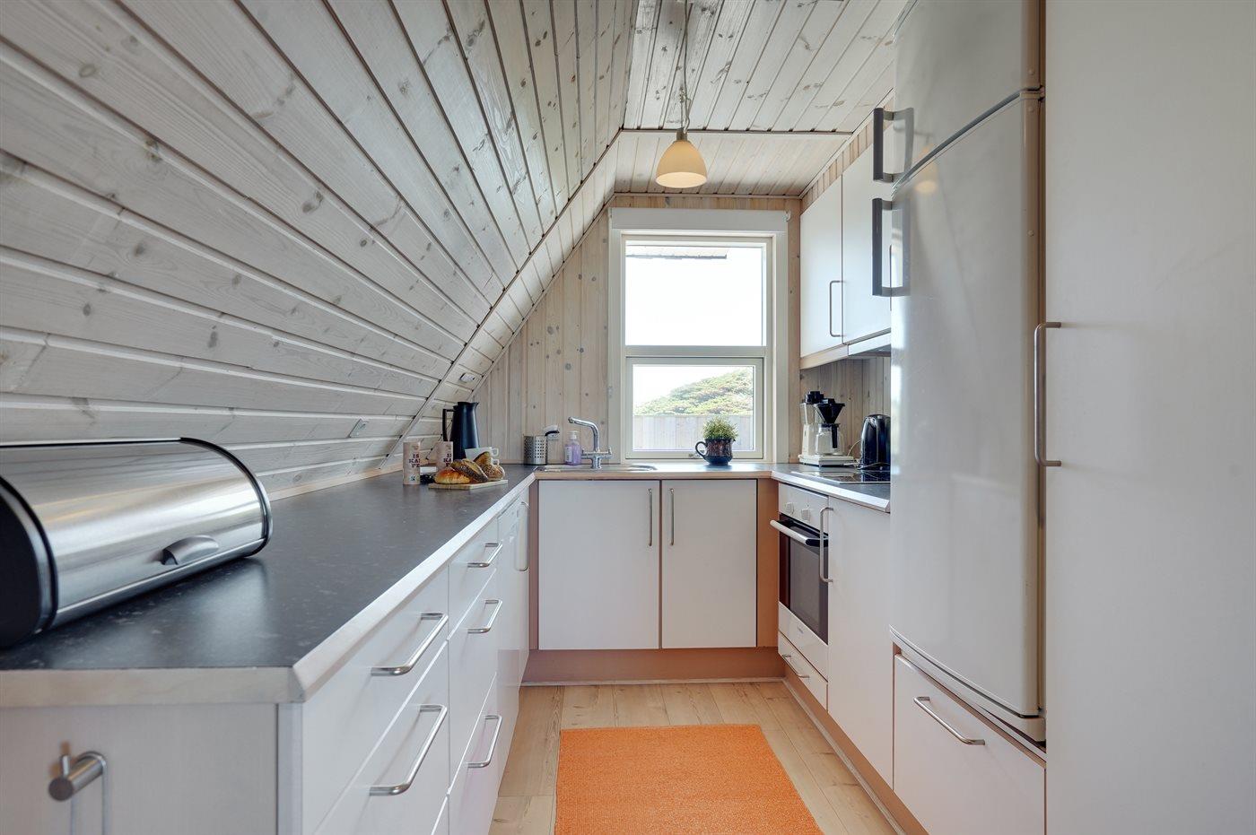 Køkkenet er udstyret med 1 køleskab. Der er 4 keramiske kogeplader, varmluftovn, mikrobølgeovn samt opvaskemaskine.