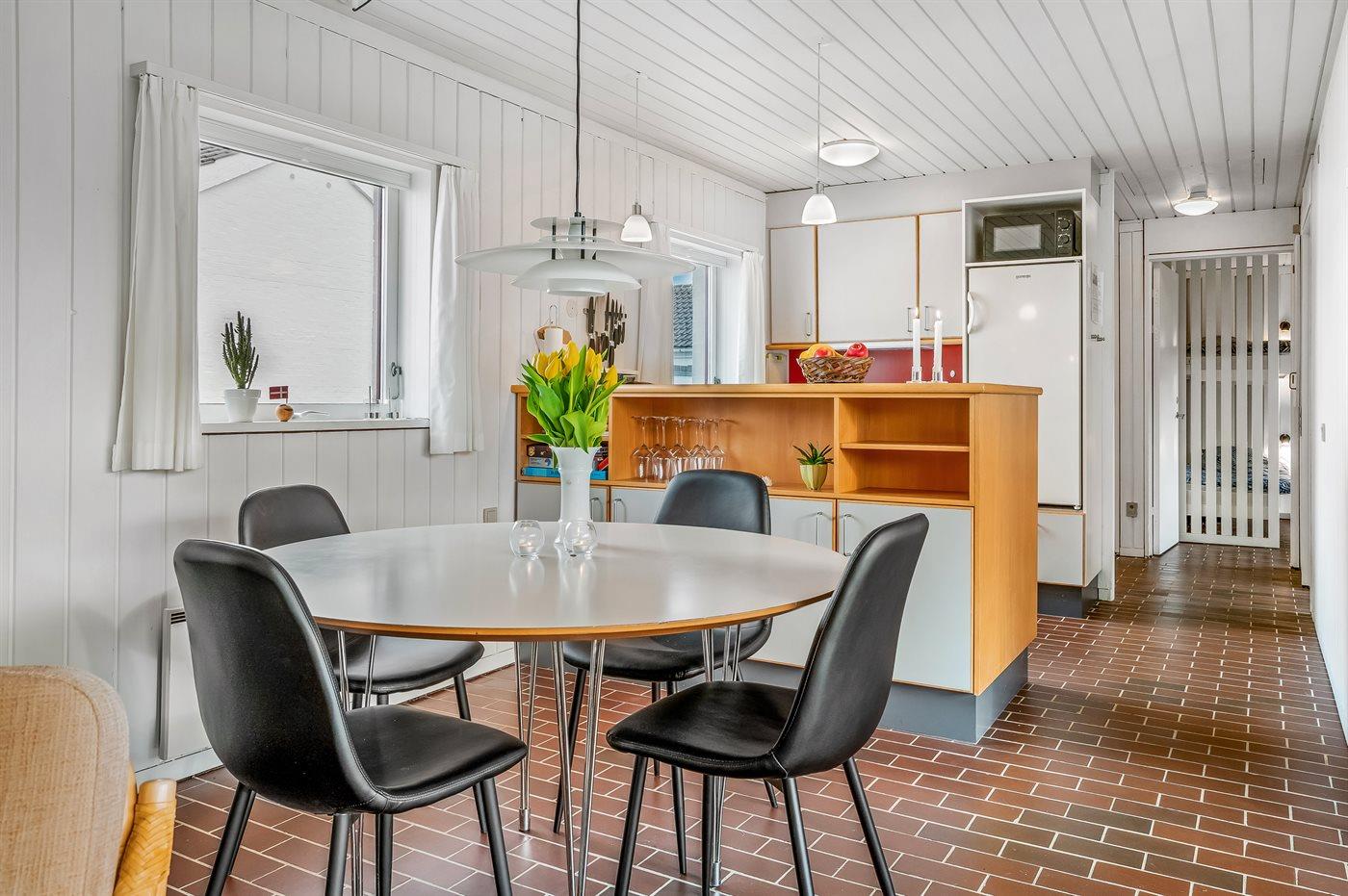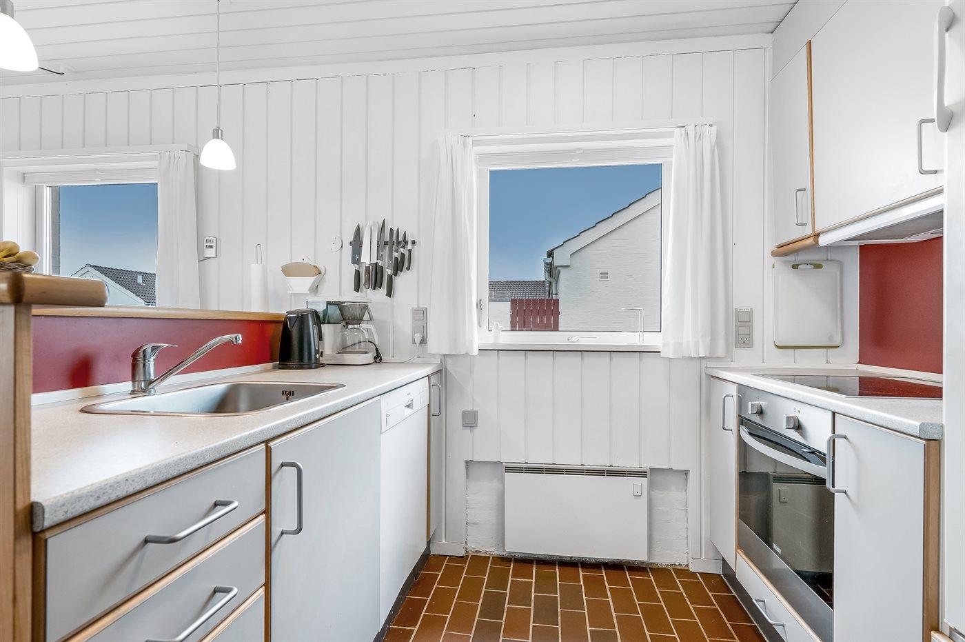 Køkkenet er udstyret med 1 køleskab. Der er 4 keramiske kogeplader, varmluftovn, mikrobølgeovn samt opvaskemaskine.