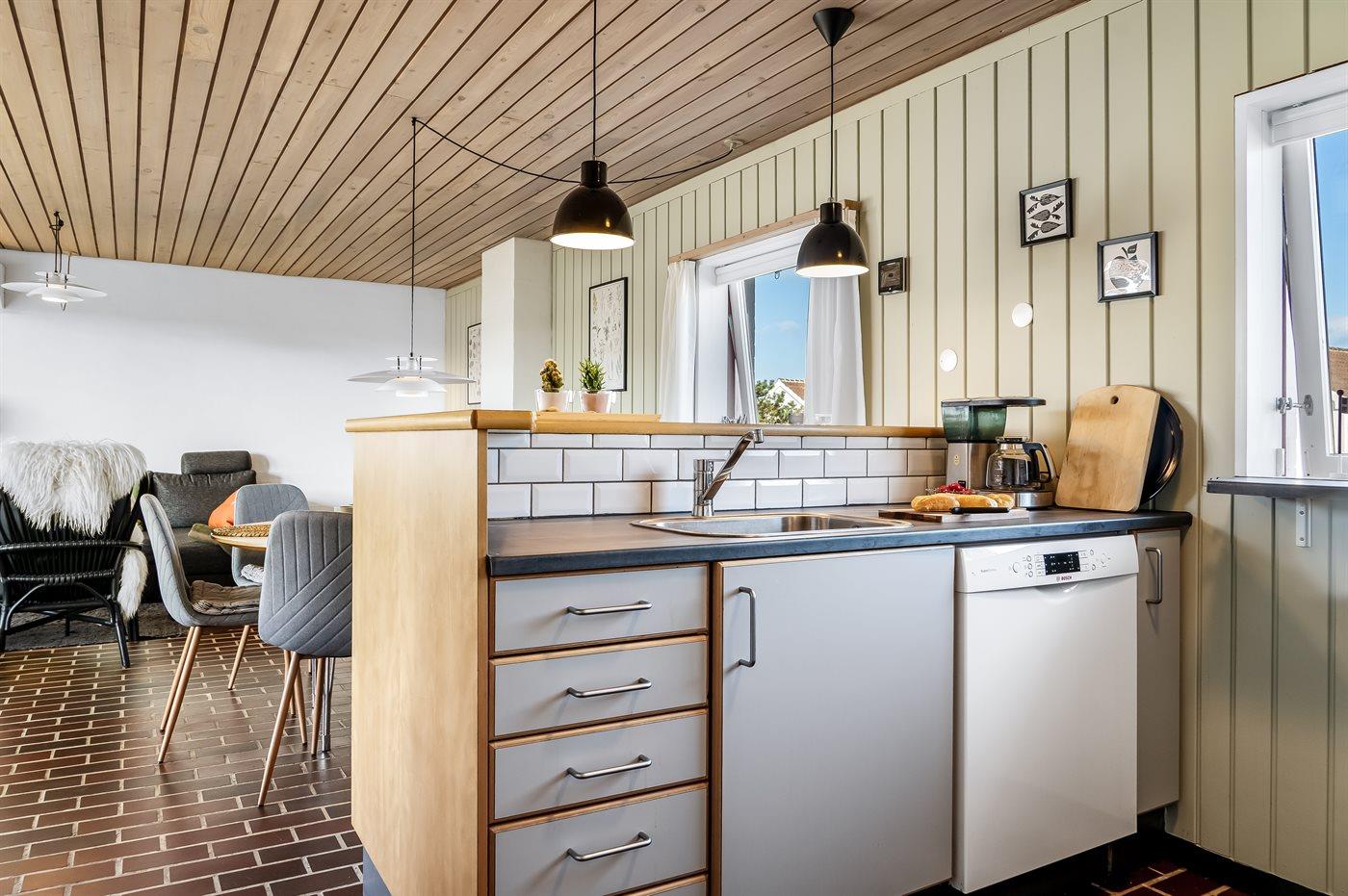 Køkkenet er udstyret med 1 køleskab. Der er 4 keramiske kogeplader, varmluftovn, mikrobølgeovn samt opvaskemaskine.