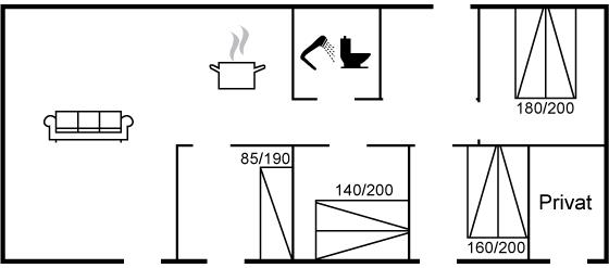 Der er i alt 3 soveværelser. Sovepladserne fordeler sig på: 6 sovepladser i dobbeltsenge.