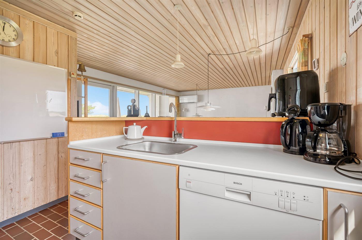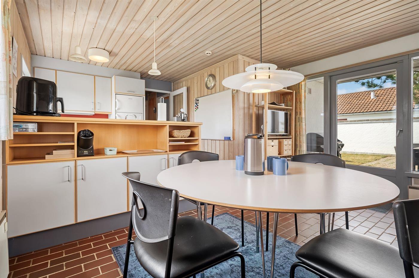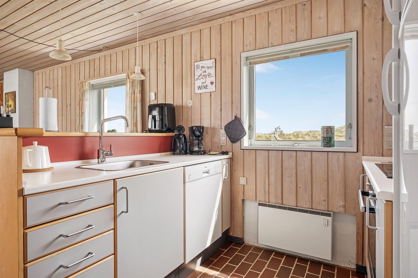 Køkkenet er udstyret med 1 køleskab. Der er 4 induktionskogeplader, varmluftovn samt opvaskemaskine.