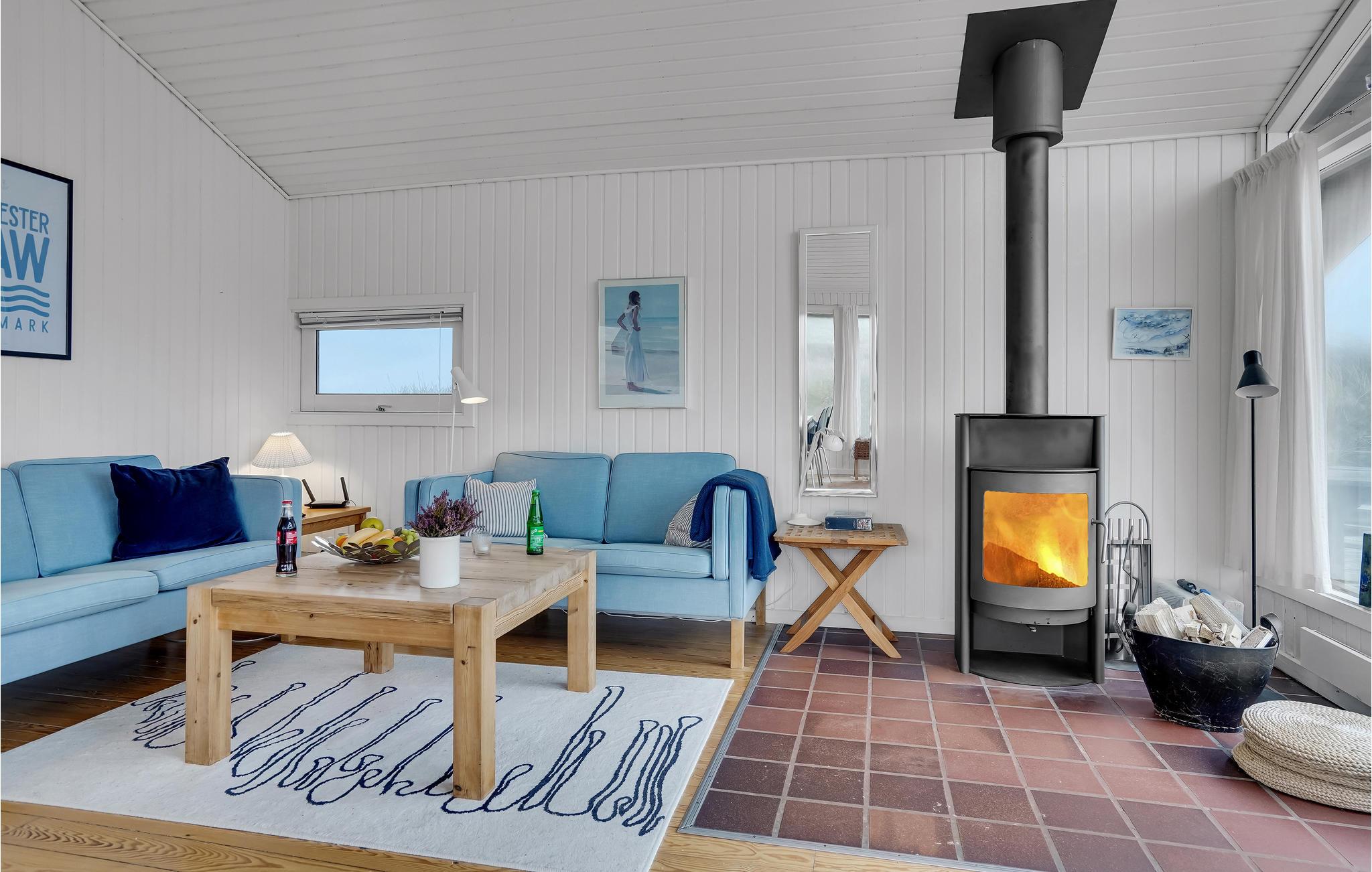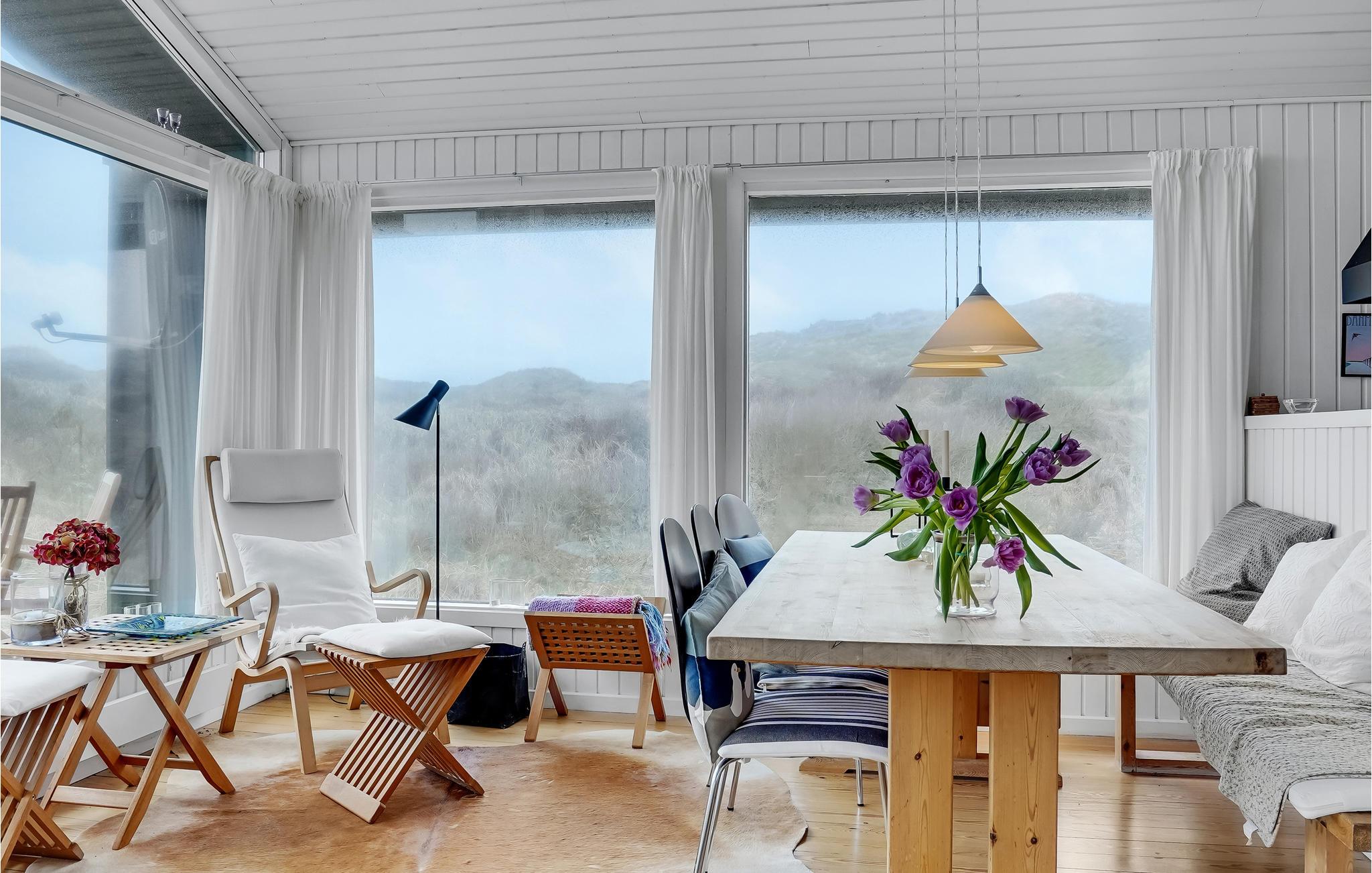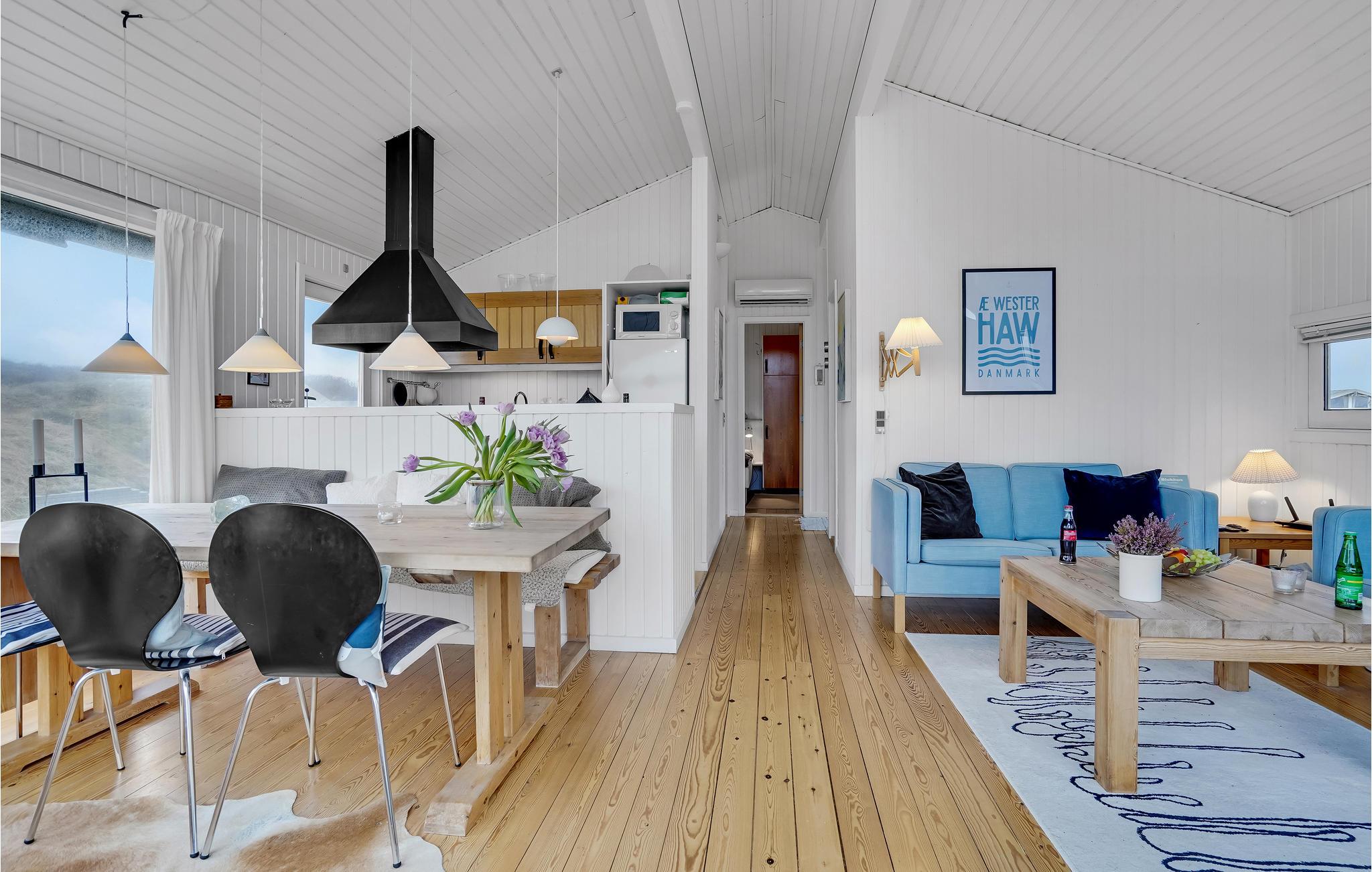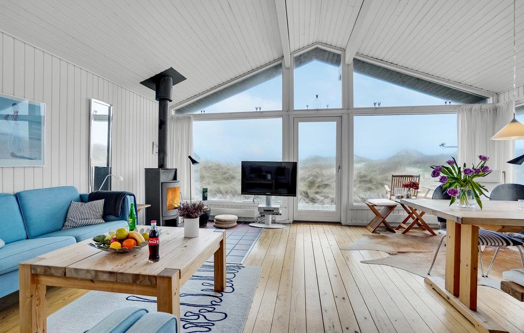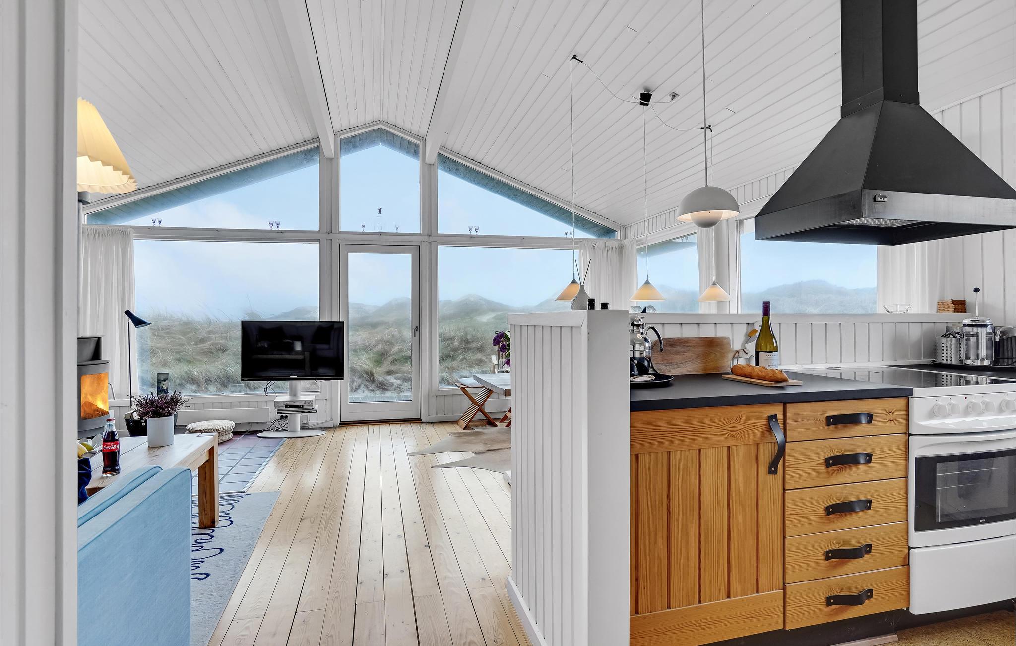 Da den ene side af huset udelukkende består af vinduer, har I en vidunderlig udsigt over klitlandskabet fra stuen med åbent til kip. Huset er smagfuldt møbleret, og den kombinerede opholds- og spisestue med åbent køkken, brændeovn og fladskærm bliver samlingspunktet til mange hyggestunder.