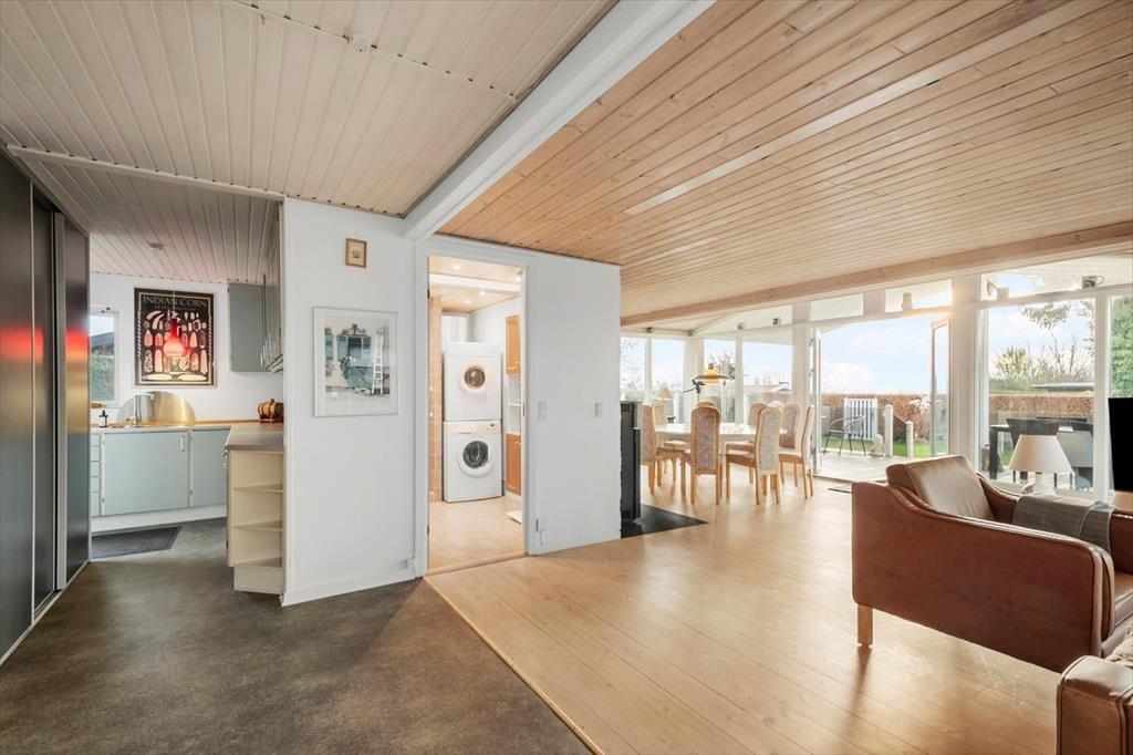 Her er et godt køkken, med spiseplads hvor I alle kan nyde dagens måltider sammen. Fra køkkenet er der trin ned til en stor stue, som har gulvvarme, sofagruppe og TV med streaming og en dejlig spiseplads. Her er god plads til jer alle og her kan I hygge jer sammen og nyde hinandens selskab. På kolde dage kan I tænde op i brændeovnen og hygge jer inden døre med et brætspil og måske hjemmebagte boller, imens det knitrer i brændeovnen (pilleovn). Fra stuen er der udgang til den store delvis overdækkede terrasse. Huset er indrettet med 2 soveværelser og 1 badeværelse med toilet, håndvask og bruseniche, samt vaskemaskine og tørretumbler. I dette hus er der god mulighed for at trække sig tilbage og få en lur eller læse en bog.