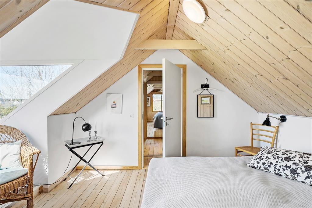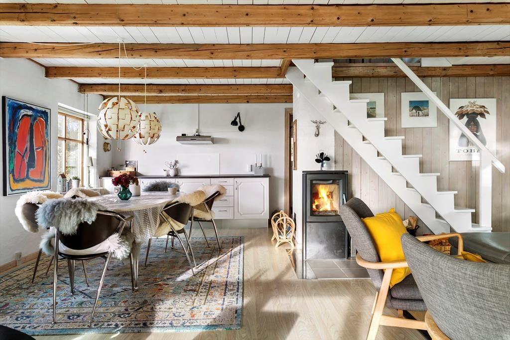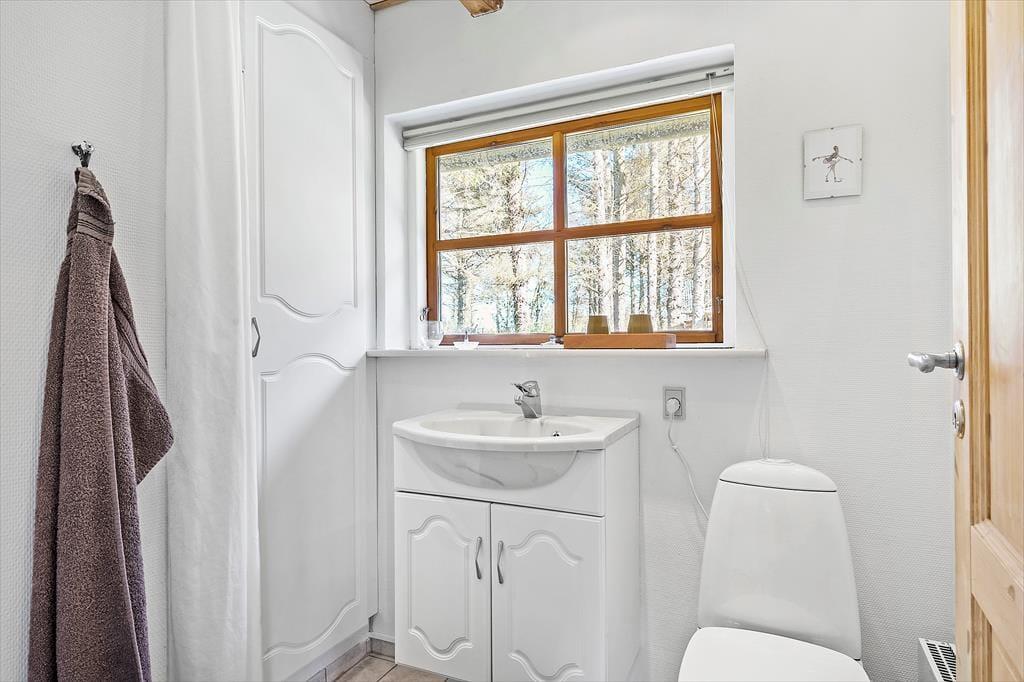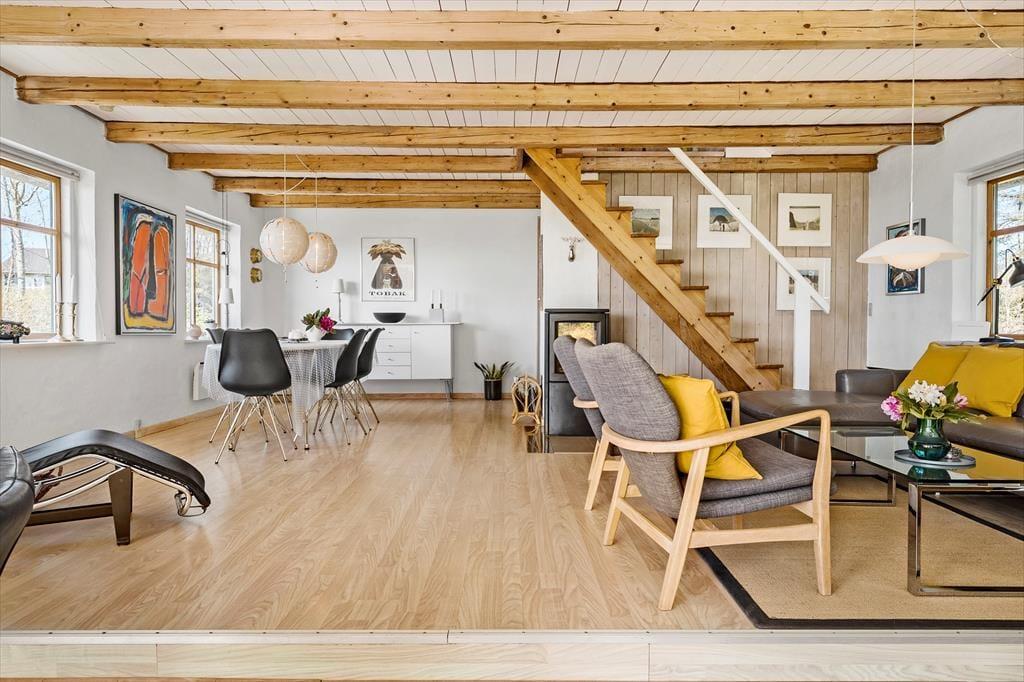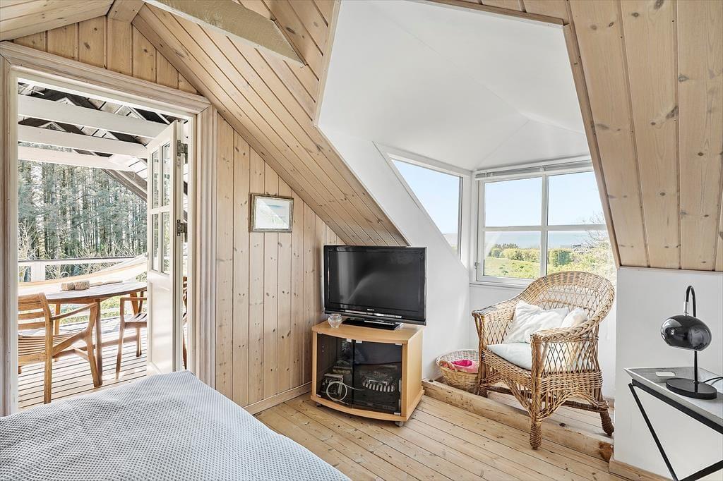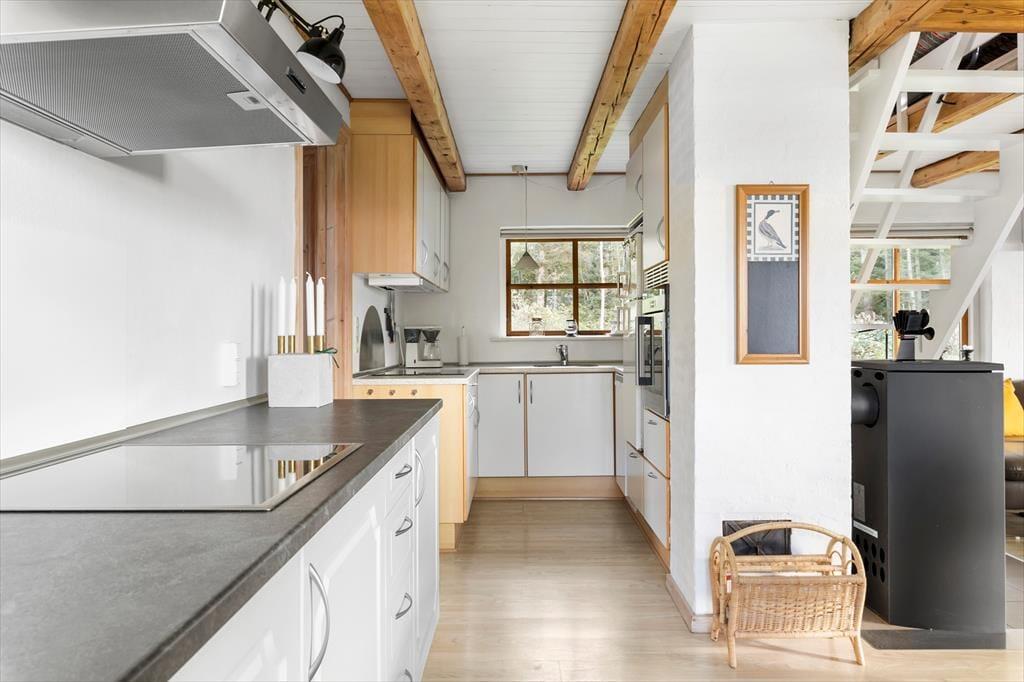Sommerhusets planløsning breder sig over to etager, og mens du finder en opholdsafdeling, et soveværelse og et badeværelse nedenunder, er der to soveværelser på førstesalen. Udsigten er fantastisk ovenpå, og hvis du trænger til en rolig stund, kan du sagtens slå dig ned med en god bog i en af kurvestolene. Hvis du hellere vil hygge dig med familien, kan I passende samles i stuen, hvor store vinduer inviterer sollyset og de naturskønne omgivelser indenfor. Brændeovnen vil sikkert vække glæde hvis du holder ferie på kølige tider af året, og køkkenet sørger for, at du har en både hyggelig og velfungerende ramme, når du skal lave mad.