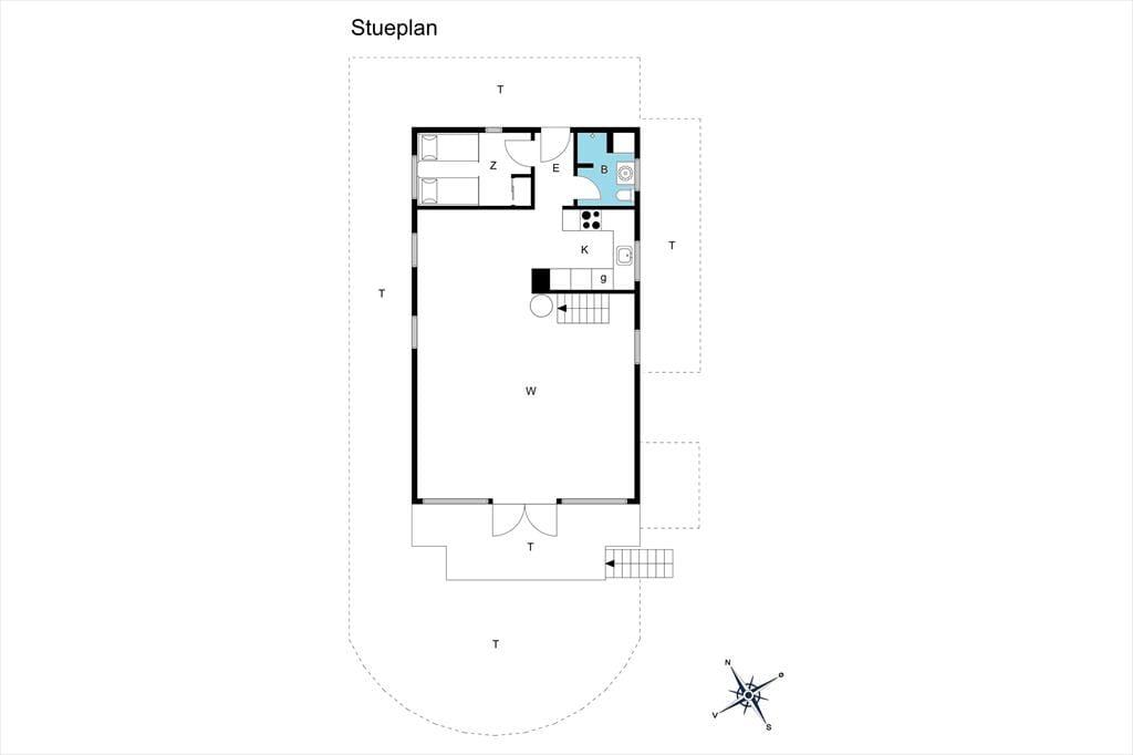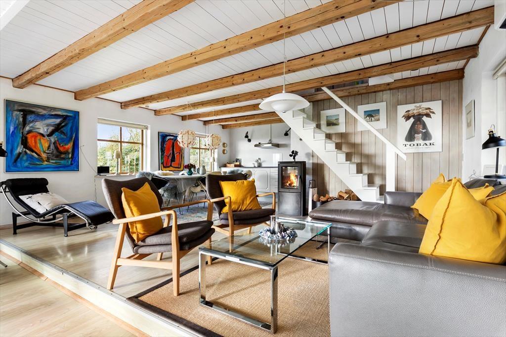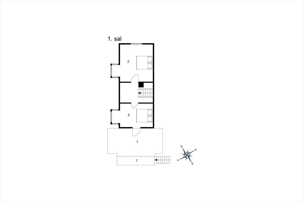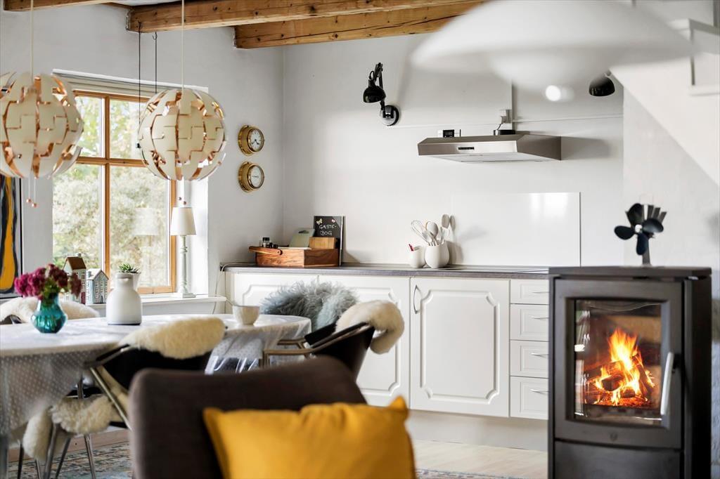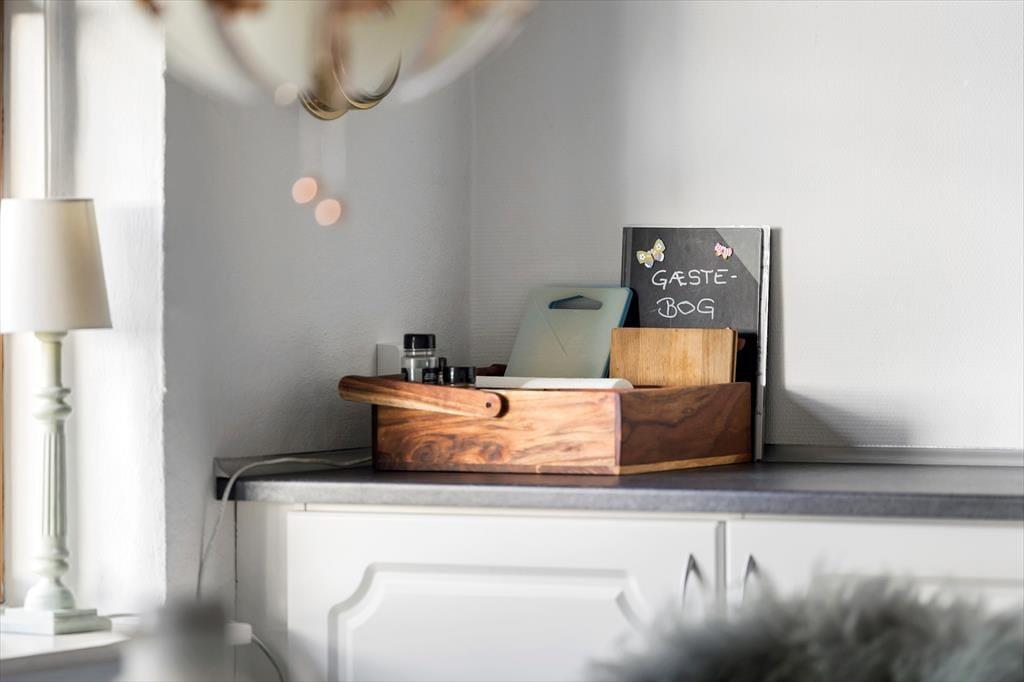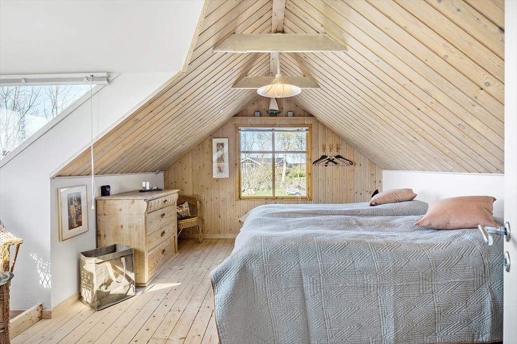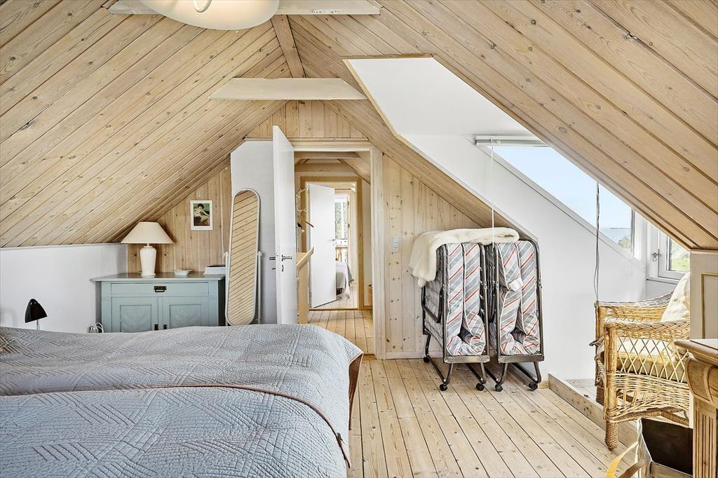 Sommerhusets planløsning breder sig over to etager, og mens du finder en opholdsafdeling, et soveværelse og et badeværelse nedenunder, er der to soveværelser på førstesalen. Udsigten er fantastisk ovenpå, og hvis du trænger til en rolig stund, kan du sagtens slå dig ned med en god bog i en af kurvestolene. Hvis du hellere vil hygge dig med familien, kan I passende samles i stuen, hvor store vinduer inviterer sollyset og de naturskønne omgivelser indenfor. Brændeovnen vil sikkert vække glæde hvis du holder ferie på kølige tider af året, og køkkenet sørger for, at du har en både hyggelig og velfungerende ramme, når du skal lave mad.