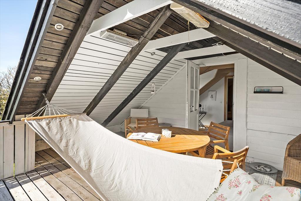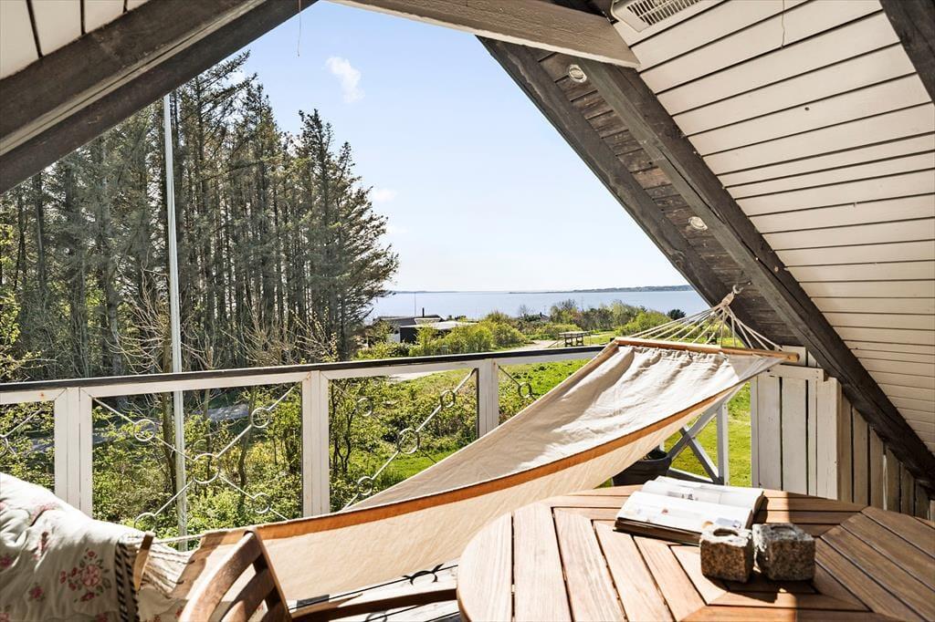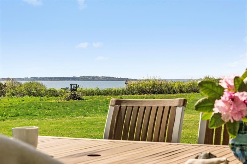 Også når du er ude i det fri, må du beslutte dig for, om du vil sidde oppe eller nede. Førstesalens delvist overdækkede altan har en imponerende fjordudsigt og er et herligt sted at være - især hvis det er din tur til at slænge dig i hængekøjen. Rundt om sommerhuset finder du flere skønne terrasser, og her kan du naturligvis også finde en siddeplads, hvor du kan skue ud over det flotte fjordlandskab, mens du drikker iskaffe eller spiser sommerfrokost med familien. Skal hele ferien ikke foregå på tilbagelænet vis, er der masser af plads til leg på grundens græsplæne, og den korte afstand til kysten gør det nemt at komme i nærkontakt med fjorden.