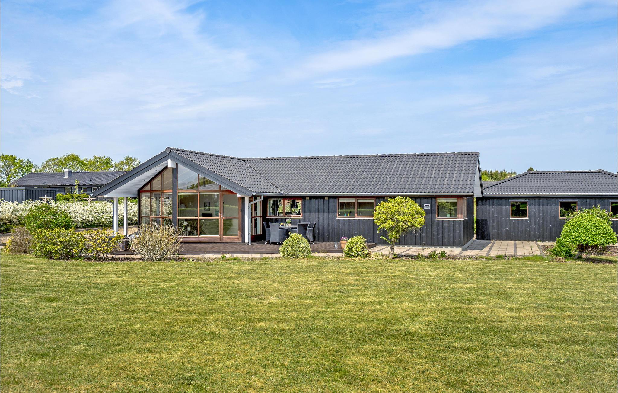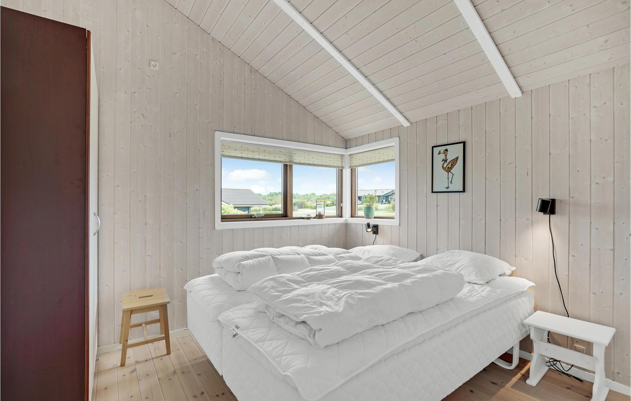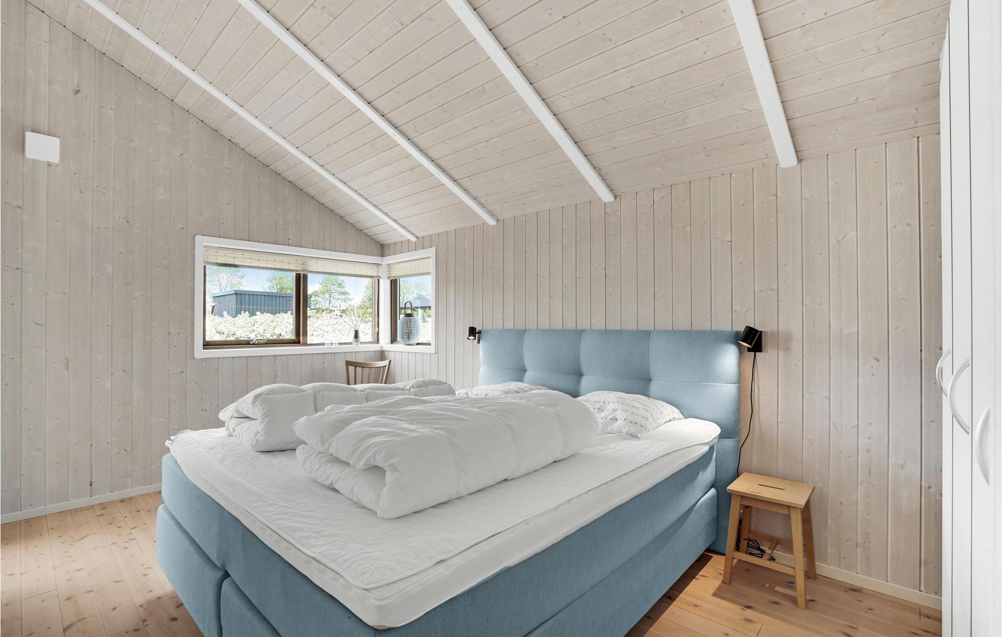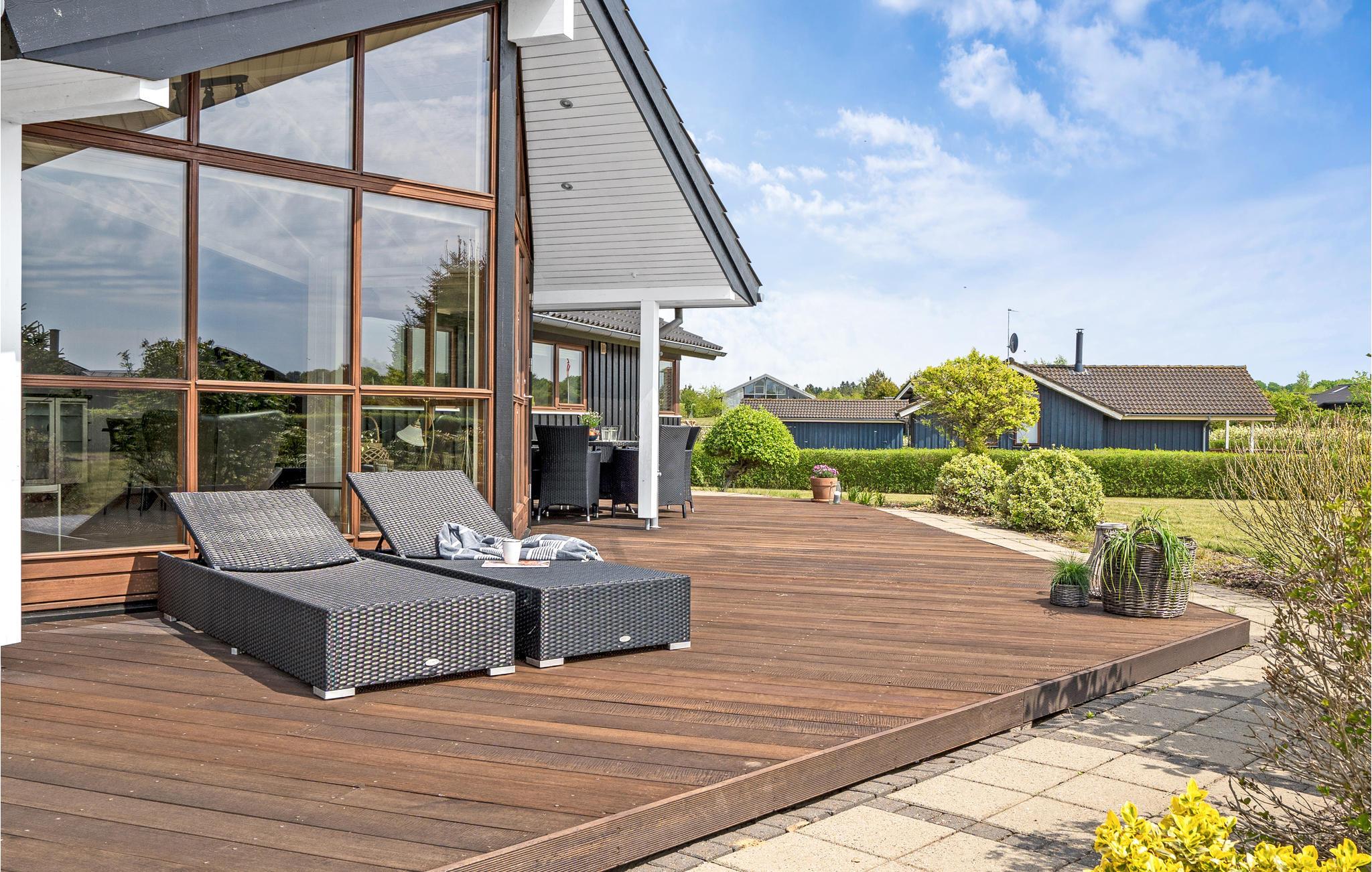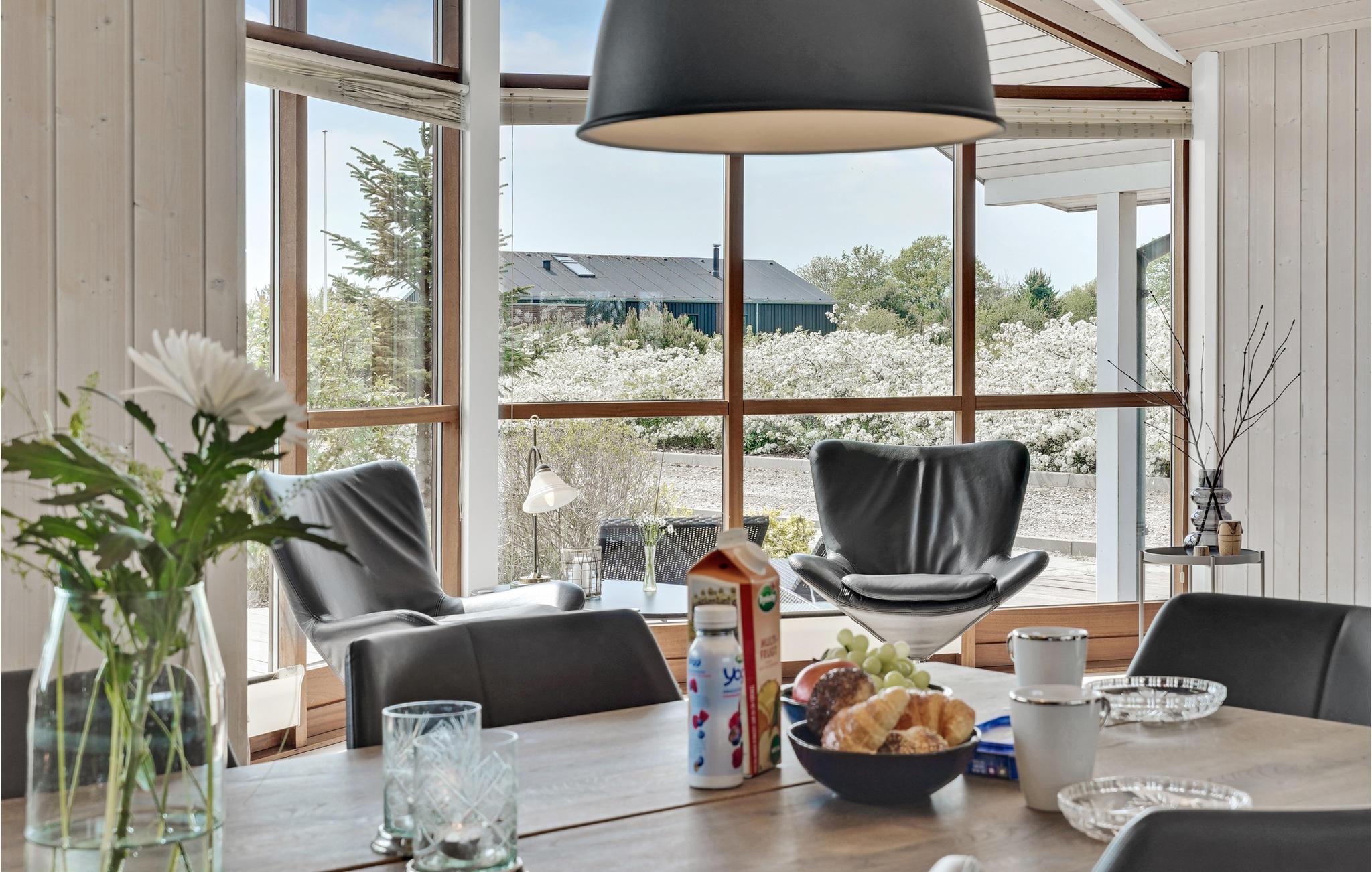 Dejligt og rummeligt feriehus opført i kvalitetsmaterialer. Huset indeholder en stor stue med en hyggelig sofagruppe og stor spiseplads i åben forbindelse med køkkenet, der er et flot, stort panoramavindue med vinduer fra gulv til loft, der giver masser af lys til rummet. Køkkenet er fuldt udstyret, og har mange skabe og god bordplads til at slippe kreativiteten løs med tilberedningen af lækre feriemåltider. Der er tre gode soveværelser - et stort soveværelse med en dobbeltseng og plads til en barneseng samt udgang til terrassen, endnu et dejligt soveværelse med en god dobbeltseng og et soveværelse med en enkeltseng; den store teenager eller en bedsteforælder vil helt sikkert sætte pris på at få sit helt eget værelse. Endvidere et dejligt, stort badeværelse med bl.a. spabad og sauna samt et gæstetoilet. Haven har en stor græsplæne med spredte buske, en stor, dejlig sydvendt træterrasse og en flisebelagt terrasse på nordsiden af huset. Til huset hører også en stor garage, så bilen kan stå i ly for både sol og regn.