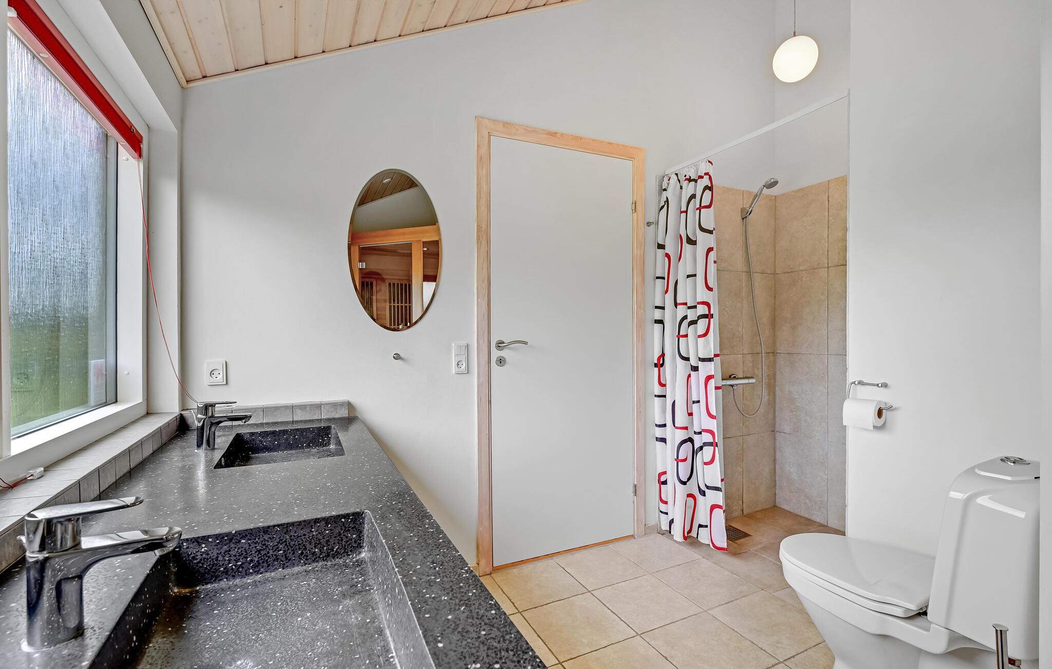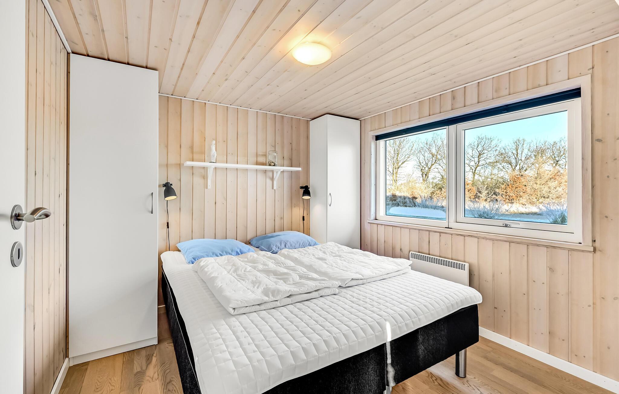 Der er tre gode soveværelser, alle med dobbeltsenge. Det store badeværelse byder på en infrarød sauna, som giver en velgørende og virkelig behagelig varme. Udendørs er der en flot, stor terrasse, hvor en del er overdækket og udstyret med gode havemøbler. Mod øst findes en morgenterrasse til de, der gerne vil nyde en stille stund inden resten af familien vågner, og mod vest en skøn overdækket aftenterrasse som indbyder til hygge, grillmiddage og dejligt samvær. I gårafstand finder I Rørbæk Sø, hvor fiskeri er tilladt i den ene del af søen - der kan købes fisketegn på stedet. Huset råder over en stor fryser og fiskerenseplads, så I kan gøre jeres fangst klar til grillen.