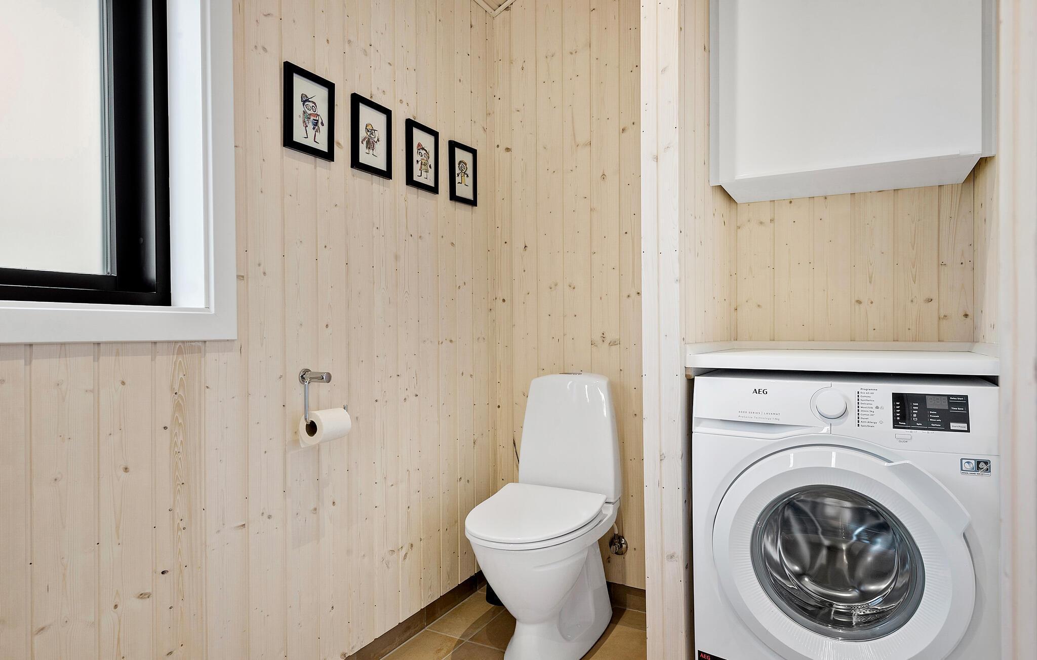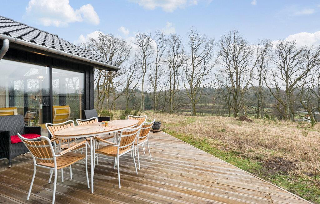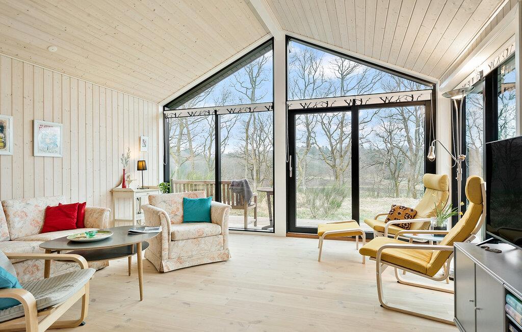 I dette smukke feriehus inviteres I til en afslappende ferie midt i naturen. Indendørs byder det rummelige køkkenalrum med loft til kip og store vinduespartier på lys og skøn natur, ideelt til familiemåltider og hyggestunder. De lyse farver og den moderne indretning skaber en behagelig atmosfære, hvor I kan trække jer tilbage og nyde ferien i komplet ro.