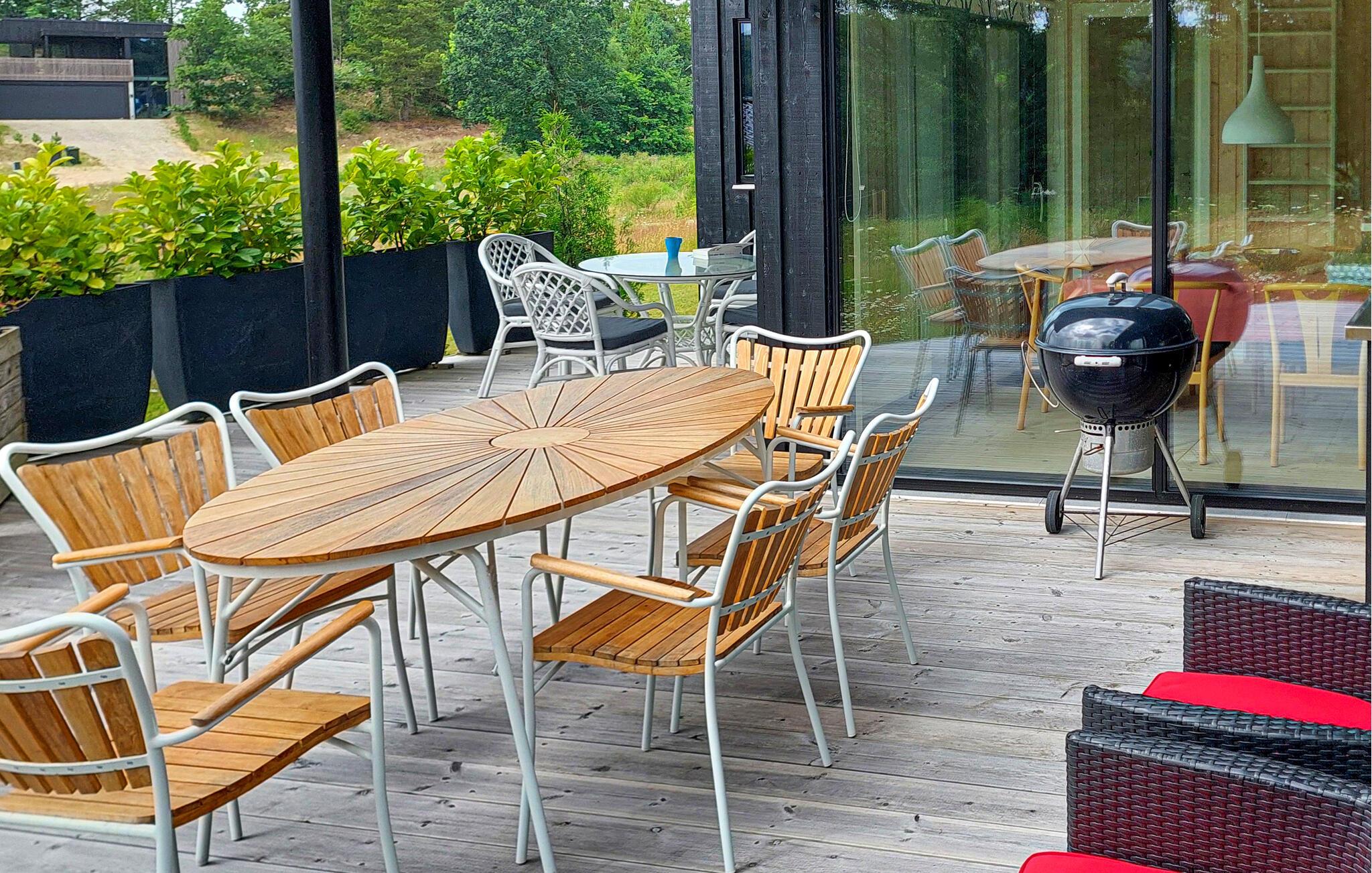Udendørs omgiver en privat terrasse jer med både åbne og overdækkede områder, havemøbler og en grill til lækre udendørs måltider med udsigt til søen. Nyd solen og naturens ro eller saml jer om bordet til en spilleaften under stjernerne.