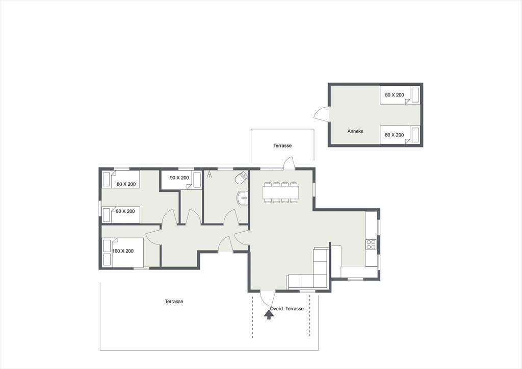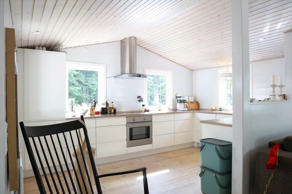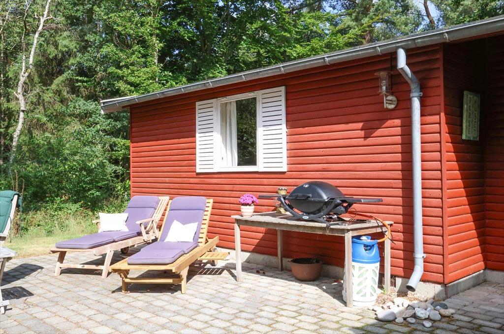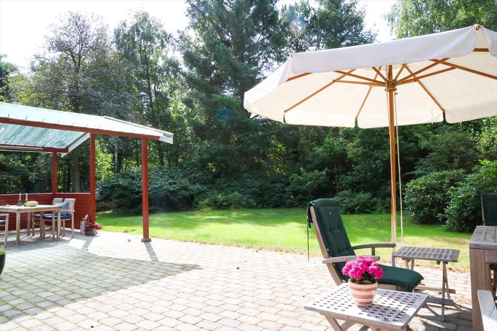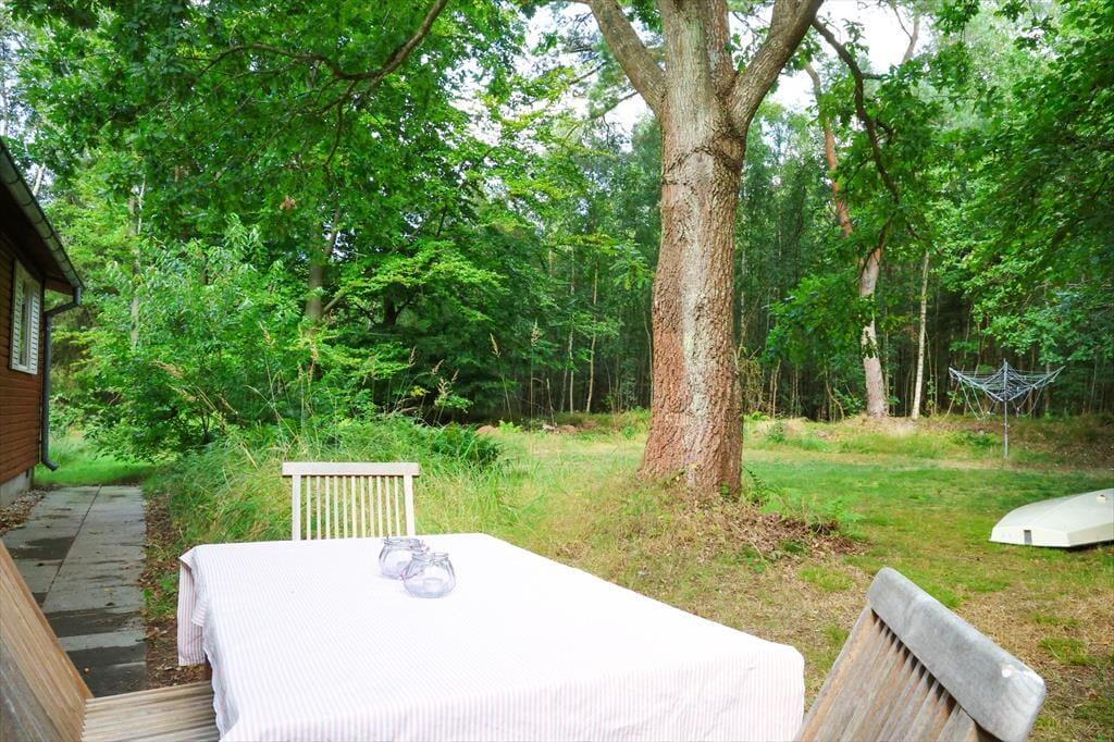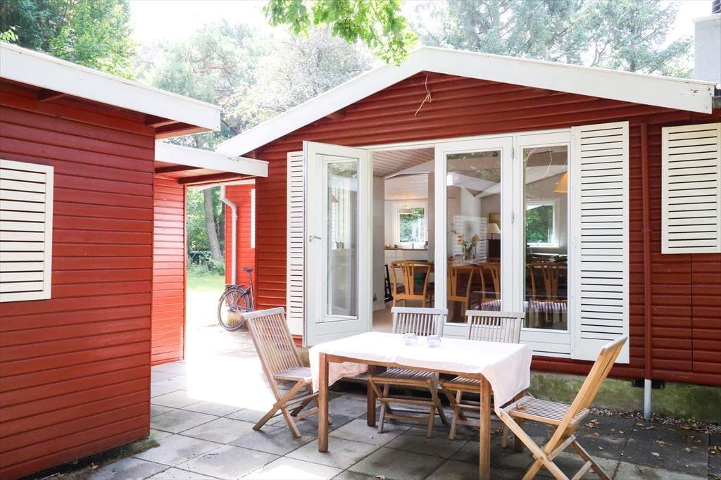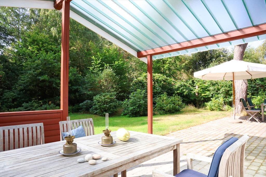 Udendørs kan sommerhusets store træterrasse nydes, her kan du ligge og slikke sol eller fordybe dig i en god bog imens børnene boltrer sig i haven med medbragte havespil. Der er også plads til, at alle kan samles til en god frokost, eller middag om aftenen på den overdækkede afdeling. Sommerhusets store have er godt afskærmet så du og familien kan nyde jeres ferie i fredelige omgivelser. Når du har været nede at bade på den gode sandstrand, er det skønt bare at slænge dig på terrassen og lytte til fuglenes sang eller se på et rådyr der passerer forbi.