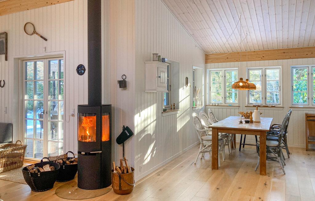 Træd indenfor, og mærk straks den varme og indbydende atmosfære i indretningen. Tag plads i den rummelige opholdsstue, og nyd den dejlige varme fra den centrale brændeovn, som på køligere dage skaber en særlig behagelig stemning. Lad blikket glide ud i haven gennem de mange vinduer, mens komfortable lænestole og sofaer indbyder til afslappede stunder. Saml jer omkring det lange træbord til måltiderne, eller planlæg de næste dages oplevelser her sammen. Kærligt udvalgte detaljer i gangen fuldender det harmoniske helhedsindtryk.