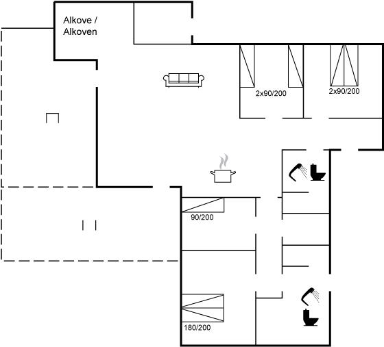 Der er i alt 4 soveværelser. Sovepladserne fordeler sig på: 4 sovepladser i dobbeltsenge. 3 sovepladser i enkeltsenge.
