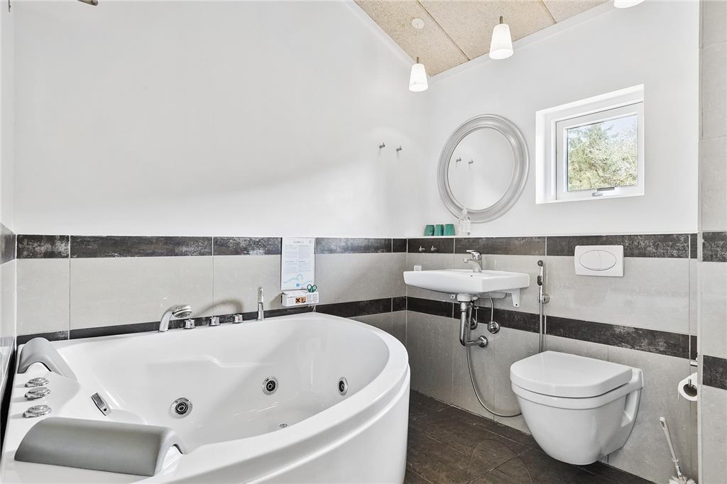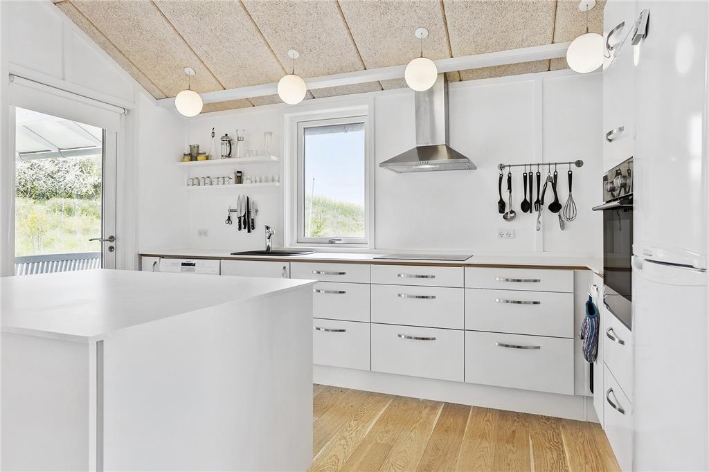Feriehuset som er fra 2011 er indrettet med kombineret køkken og opholdsstue. Åbent køkken med indbygget ovn, Induktionskogeplader, mikroovn, opvaskemaskine og køleskab med fryser. Opholdsstue med loft til kip, udgang til delvis overdækket terrasse, lædersofaer, god spiseplads med stort lysindfald, brændeovn, TV med danske DR kanaler, parabol (tyske kanaler) Chromecast til streaming (kræver eget abonnement) og dvd. 2 Badeværelser, hvoraf det ene har spabad, med bruseniche og gulvarme. vaskemaskine og tørretumbler. Fire soveværelser, 2 med dobbeltsenge og 2 med 2 enkeltsenge. Huset opvarmes med jordvarme, baseret på en varmepumpe, og med brændeovn. Der er desuden barneseng og barnestol til rådighed.
