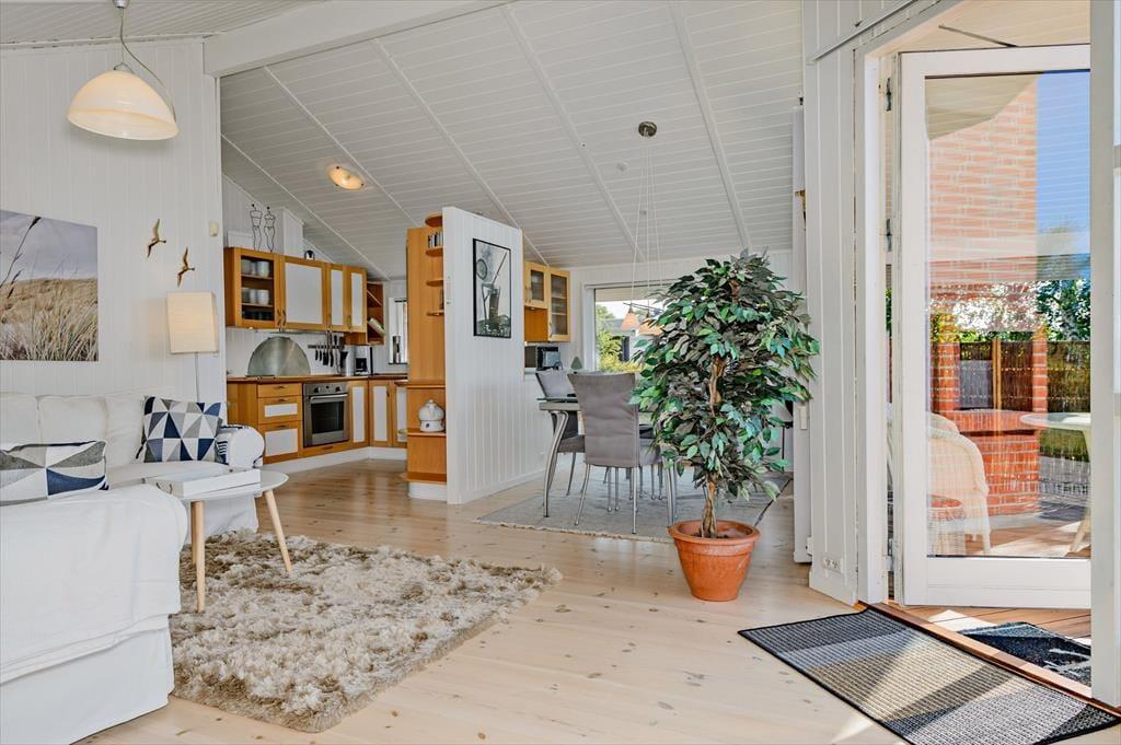 Feriehuset er lyst indrettet med 3 gode soveværelser alle med komfortable dobbeltsenge + 1 alkove med en enkelt seng. Der er gæstetoilet samt et stort badeværelse i huset, hvor du kan nyde husets spabad og sauna. Velindrettet køkken i forbindelse med opholdsstuen, hvor der også er spiseplads. Fra stuen er der adgang til stor delvist overdækket terrasse. Huset opvarmes med varmepumpe og elvarme.