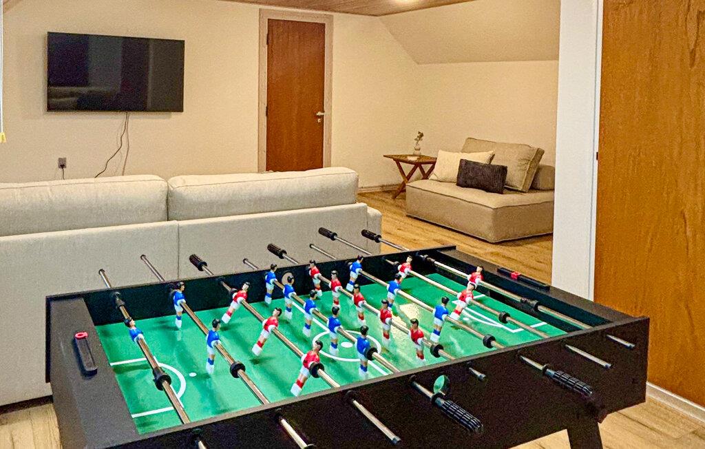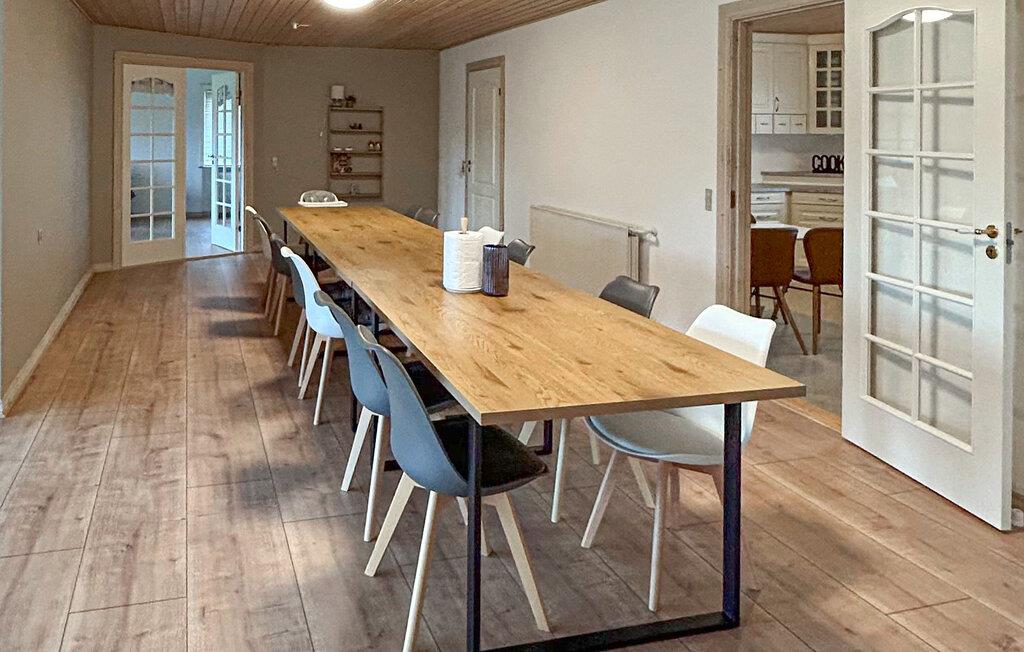 Dette store hus tilbyder jer alt, hvad I behøver for en rolig pause fra hverdagen. Gennem de store vinduer strømmer der masser af varmt dagslys ind, mens I hygger jer med en kop kaffe og gode samtaler. Find ro, og få ny energi under en hyggelig filmaften, eller mens I laver mad sammen. Hvis I har lyst til lidt sjov og leg, kan I tage en omgang bordfodbold.