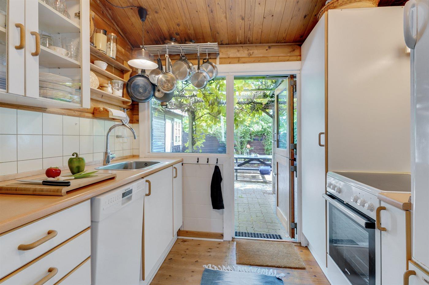 Køkkenet er udstyret med 1 køleskab. Der er 4 keramiske kogeplader, varmluftovn, mikrobølgeovn samt opvaskemaskine.